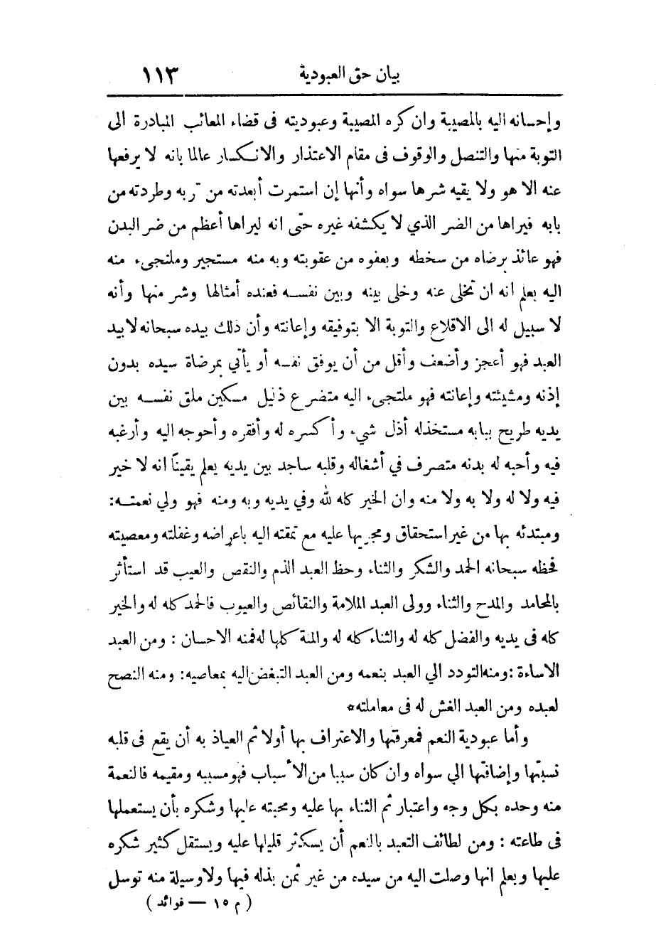 وإحسانه إِلَيْهِ بالمصيبة وَإِن كره الْمُصِيبَة وعبوديته فِي قَضَاء المعائب الْمُبَادرَة إِلَى التَّوْبَة مِنْهَا والتنصل وَالْوُقُوف فِي مقَام الِاعْتِذَار والانكسار عَالما بِأَنَّهُ لَا يرفعها عَنهُ إِلَّا هُوَ وَلَا يَقِيه شَرها سواهُ وَأَنَّهَا إِن استمرت أبعدته من ربه وطردته من بَابه فيراها من الضّر الَّذِي لَا يكشفه غَيره حَتَّى انه ليراها أعظم من ضرّ الْبدن فه عَائِذ بِرِضَاهُ من سخطه وبعفوه من عُقُوبَته وَبِه مِنْهُ مستجير وملتجىء مِنْهُ اليه بِعلم أَنه إِن تخلى عَنهُ وخلى بَينه وَبَين نَفسه فعده أَمْثَالهَا وَشر مِنْهَا وَأَنه لَا سَبِيل لَهُ إِلَى الإقلاع وَالتَّوْبَة إِلَّا بتوفيقه وإعانته وَأَن ذَلِك بِيَدِهِ سُبْحَانَهُ لَا بيد العَبْد فَهُوَ أعجز وأضعف وَأَقل من أَن يوفق نَفسه أَو يَأْتِي بمرضاة سَيّده بِدُونِ إِذْنه ومشيئته وإعانته فَهُوَ ملتجىء إِلَيْهِ متضرع ذليل مِسْكين مُلْقٍ نَفسه بَين يَدَيْهِ طريح بَابه مستخذله أذلّ شَيْء وأكسره لَهُ وأفقره وأحوجه إِلَيْهِ وأرغبه فِيهِ وأحبه لَهُ بدنه متصرف فِي أشغاله وَقَلبه ساجد بَين يَدَيْهِ يعلم يَقِينا انه لَا خبر فِيهِ وَلَا لَهُ وَلَا بِهِ وَلَا مِنْهُ وَأَن الْخَيْر كُله لله وَفِي يَدَيْهِ وَبِه وَمِنْه فَهُوَ ولي نعْمَته ومبتدئه بهَا من غير اسْتِحْقَاق ومجريها عَلَيْهِ مَعَ تمقته إِلَيْهِ بإعراضه وغفلته ومعصيته فحظه سُبْحَانَهُ الْحَمد وَالشُّكْر وَالثنَاء وحظ العَبْد الذَّم وَالنَّقْص وَالْعَيْب قد اسْتَأْثر بالمحامد والمدح وَالثنَاء وَولى العَبْد الْمَلَامَة والنقائص ولعيوب فَالْحَمْد كُله لَهُ وَالْخَيْر كُله فِي يَدَيْهِ وَالْفضل كُله لَهُ وَالثنَاء كُله لَهُ والْمنَّة كلهَا لَهُ فَمِنْهُ الْإِحْسَان وَمن العَبْد الْإِسَاءَة وَمِنْه التودد إِلَى العَبْد بنعمه وَمن العَبْد التبغض إِلَيْهِ بمعاصيه وَمِنْه النصح لعَبْدِهِ وَمن العَبْد الْغِشّ لَهُ فِي مُعَامَلَته