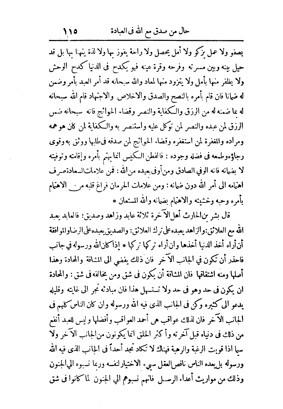 قَالَ بشر بن الْحَارِث أهل الْآخِرَة ثَلَاثَة عَابِد وزاهد وصِدِّيق فالعابد يعبد الله مَعَ العلائق والزاهد يعبده على ترك العلائق وَالصديق يعبده على الرِّضَا والموافقة إِن أرَاهُ أَخذ الدُّنْيَا أَخذهَا وَإِن أرَاهُ تَركهَا تَركهَا إِذا كَانَ الله وَرَسُوله فِي جَانب فاحذر أَن تكون فِي الْجَانِب الآخر فَإِن ذَلِك يُفْضِي إِلَى المشاقة والمحادّة وَهَذَا أَصْلهَا وَمِنْه اشتقاقها فَإِن المشاقة أَن يكون فِي شقّ وَمن يُخَالِفهُ فِي شقّ والمحادة ان يكون حد وَهُوَ فِي حد وَلَا تستسهل هَذَا فَإِن مبادئه تجر إِلَى غَايَته وقليله يَدْعُو إِلَى كَثِيره وَكن فِي الْجَانِب الَّذِي يكون فِيهِ الله وَرَسُوله وان كَانَ النَّاس كلهم فِي الْجَانِب الآخر فَإِن لذَلِك عواقب هِيَ أَحْمد العواقب وأفضلها وَلَيْسَ للْعَبد أَنْفَع من ذَلِك فِي دُنْيَاهُ قبل آخرته وَأكْثر الْخلق إِنَّمَا يكونُونَ من الْجَانِب الآخر ولاسيما إِذا قويت الرَّغْبَة والرهبة فهناك لَا تكَاد تَجِد أحدا فِي الْجَانِب الَّذِي فِيهِ الله وَرَسُوله بل يعدّه النَّاس نَاقص الْعقل سيء الِاخْتِيَار لنَفسِهِ وَرُبمَا نسبوه إِلَى الْجُنُون وَذَلِكَ من مَوَارِيث أَعدَاء الرُّسُل فَإِنَّهُم نسبوهم غلى الْجُنُون لما كَانُوا فِي شقّ