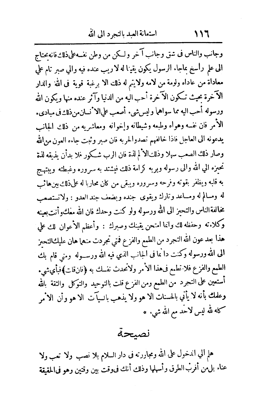 وجانب وَالنَّاس فِي شقّ وجانب آخر وَلَكِن من وطّن نَفسه على ذَلِك فَإِنَّهُ يحْتَاج إِلَى علم راسخ بِمَا جَاءَ بِهِ الرَّسُول يكون يَقِينا لَهُ لَا ريب عِنْده فِيهِ وَإِلَى صَبر تَامّ على معاداة من عَادَاهُ ولومة من لامه وَلَا يتم لَهُ ذَلِك إِلَّا برغبة قَوِيَّة فِي الله وَالدَّار وَالْآخِرَة بِحَيْثُ تكون الْآخِرَة أحب إِلَيْهِ من الدُّنْيَا وآثر عِنْده مِنْهَا وَيكون الله وَرَسُوله أحب إِلَيْهِ مِمَّا سواهُمَا وَلَيْسَ شَيْء أصعب على الْإِنْسَان من ذَلِك فِي مبادىء الْأَمر فَإِن نَفسه وهواه وطبعه وشيطانه وإخوانه ومعاشيره من ذَلِك الْجَانِب يدعنه إِلَى العاجل فَإِذا خالفوهم تصدوا الحربة فَإِن صَبر وَثَبت جَاءَهُ العون من الله وَصَارَ ذَلِك الصعب سهلا وَذَلِكَ الْأَلَم لَذَّة فَإِن الرب شكور فَلَا بُد أَن يذيقه لَذَّة تحيزه إِلَى الله وَإِلَى رَسُوله ويريه كَرَامَة ذَلِك فيشتد بِهِ سروره وغبطته ويبتهج بِهِ قلبه ويظفر بقوته وفرحه وسروره وَيبقى من كَانَ مُحَاربًا لَهُ على ذَلِك بَين هائب لَهُ مسالم لَهُ ومساعد وتارك ويقوى جنده ويضعف جند الْعَدو وَلَا تستصعب مُخَالفَة النَّاس والتحيز إِلَى الله وَرَسُوله وَلَو كنت وَحدك فَإِن الله مَعَك وَأَنت بِعَيْنِه وكلاءته وَحفظه لَك وَإِنَّمَا امتحن يقينك وصبرك اعظم الأعوان لَك على بعد عون الله هَذَا بعون اله التجرد من الطمع والفزع فَمَتَى تجردت مِنْهُمَا هان عَلَيْك التحيز إِلَى الله وَرَسُوله وَكنت دَائِما فِي الْجَانِب الَّذِي فِيهِ الله وَرَسُوله وَمَتى قَامَ بك الطمع فَلَا تطمع فِي هَذَا الْأَمر وَلَا تحدث نَفسك بِهِ فَإِن قلت فَبِأَي شَيْء أستعين على التجرد من الطمع وَمن الْفَزع قلت بِالتَّوْحِيدِ والتوكل والثقة بِاللَّه وعلمك بِأَنَّهُ لَا يَأْتِي بِالْحَسَنَاتِ الاهو وَلَا يذهب بالسيآت إِلَّا هُوَ وَأَن الْأَمر كُله لله لَيْسَ لأحد مَعَ الله شَيْء نصيحة