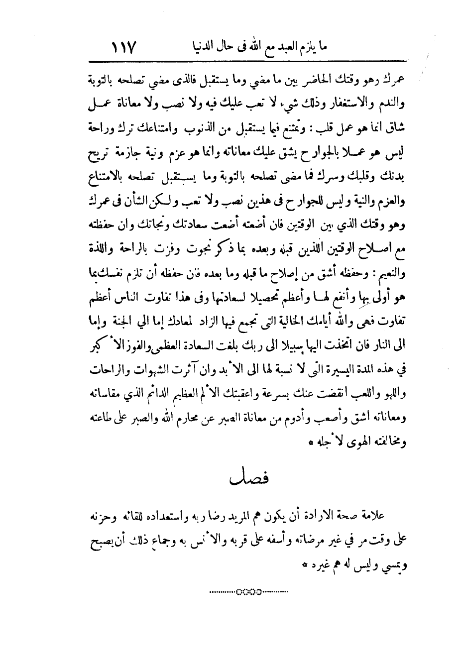 عمرك وَهُوَ وقتك الْحَاضِر بَين مَا مضى وَمَا يسْتَقْبل فَالَّذِي مضى تصلحه بِالتَّوْبَةِ والندم وَالِاسْتِغْفَار وَذَلِكَ شَيْء لَا تَعب عَلَيْك فِيهِ وَلَا نصب وَلَا معاناة عمل شاق إِنَّمَا هُوَ عمل قلب وتمتنع فِيمَا يسْتَقْبل من الذُّنُوب وامتناعك ترك وراحة لَيْسَ هُوَ عملا بالجوارح يشق عَلَيْك معاناته وَإِنَّمَا هُوَ عزم وَنِيَّة جازمة تريح بدنك وقلبك وسرك فَمَا مضى تصلحه بِالتَّوْبَةِ وَمَا يسْتَقْبل تصلحه بالامتناع والعزم وَالنِّيَّة وَلَيْسَ للجوارح فِي هذَيْن نصب وَلَا تَعب وَلَكِن الشَّأْن فِي عمرك وَهُوَ وقتك الَّذِي بَين الْوَقْتَيْنِ فَإِن أضعته أضعت سعادتك ونجاتك وَإِن حفظته مَعَ إصْلَاح الْوَقْتَيْنِ اللَّذين قبله وَبعده بِمَا ذكرت نجوت وفزت بالراحة واللذة وَالنَّعِيم وَحفظه أشق من إصْلَاح مَا قبله وَمَا بعده فَإِن حفظه أَن تلْزم نَفسك بِمَا هُوَ أولى بهَا وأنفع لَهَا وَأعظم تحصيلا لسعادتها وَفِي هَذَا تفَاوت النَّاس أعظم تفَاوت فَهِيَ وَالله أيامك الخالية الَّتِي تجمع فِيهَا الزَّاد لمعادك إِمَّا إِلَى الْجنَّة إِمَّا إِلَى النَّار فَإِن اتَّخذت إِلَيْهَا سَبِيلا إِلَى رَبك بلغت السَّعَادَة الْعُظْمَى والفوز الْأَكْبَر فِي هَذِه الْمدَّة الْيَسِيرَة الَّتِي لَا نِسْبَة لَهَا إِلَى الْأَبَد وَإِن آثرت الشَّهَوَات والراحات وَاللَّهْو واللعب انْقَضتْ عَنْك بِسُرْعَة وأعقبتك الْأَلَم الْعَظِيم الدَّائِم الَّذِي مقاساته ومعاناته أشق وأصعب وأدوم من معاناة الصَّبْر عَن محارم الله وَالصَّبْر على طَاعَته وَمُخَالفَة الْهوى لأَجله