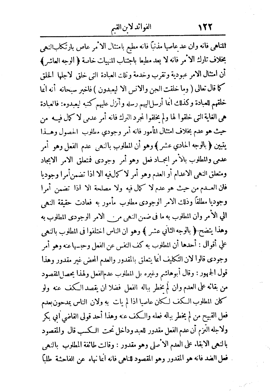 المناهي فَإِنَّهُ وَإِن عد عَاصِيا مذنبا فَإِنَّهُ مُطِيع بامتثال الْأَمر عَاص بارتكاب النَّهْي بِخِلَاف تَارِك الْأَمر فَإِنَّهُ لَا يعد مُطيعًا باجتناب المنهيات خَاصَّة الْوَجْه الْعَاشِر أَن امْتِثَال الْأَمر عبودية وتقرب وخدمة وَتلك الْعِبَادَة الَّتِي خلق لأَجلهَا الْخلق كَمَا قَالَ تَعَالَى {وَمَا خَلَقْتُ الْجِنَّ وَالْأِنْسَ إِلَّا ليعبدون} فَأخْبر سُبْحَانَهُ أَنه إِنَّمَا خلقهمْ لِلْعِبَادَةِ وَكَذَلِكَ إِنَّمَا أرسل إِلَيْهِم رسله وَأنزل عَلَيْهِم كتبه ليعبدوه فالعبادة هِيَ الْغَايَة الَّتِي خلقُوا لَهَا وَلم يخلقوا لمُجَرّد التّرْك فَإِنَّهُ أَمر عدمي لَا كَمَال فِيهِ من حَيْثُ هُوَ عدم بِخِلَاف امْتِثَال الْمَأْمُور فَإِنَّهُ أَمر وجودي مَطْلُوب الْحُصُول وَهَذَا يتَبَيَّن بِالْوَجْهِ الْحَادِي عشر وَهُوَ أَن الْمَطْلُوب بِالنَّهْي عدم الْفِعْل وَهُوَ أَمر عدمي وَالْمَطْلُوب بِالْأَمر إِيجَاد فعل وَهُوَ أَمر وجودي فمتعلق الْأَمر الايجاد ومتعلق النَّهْي الإعدام أَو الْعَدَم وَهُوَ أَمر لَا كَمَال فِيهِ إِلَّا إِذا تضمن أمرا وجوديا فَإِن الْعَدَم من حَيْثُ هُوَ عدم لَا كَمَال فِيهِ وَلَا مصلحَة إِلَّا إِذا تضمن أمرا وجوديا مُطلقًا وَذَلِكَ الْأَمر الوجودي مَطْلُوب مَأْمُور بِهِ فَعَادَت حَقِيقَة النَّهْي إِلَى الْأَمر وَأَن الْمَطْلُوب بِهِ مَا فِي ضمن النَّهْي من الْأَمر الوجودي الْمَطْلُوب بِهِ وَهَذَا يَتَّضِح بِالْوَجْهِ الثَّانِي عشر وَهُوَ أَن النَّاس اخْتلفُوا فِي الْمَطْلُوب بِالنَّهْي على أَقْوَال أَحدهَا أَن الْمَطْلُوب بِهِ كف النَّفس عَن الْفِعْل وحبسها عَنهُ وَهُوَ أَمر وجودي قَالُوا لِأَن التَّكْلِيف إِنَّمَا يتَعَلَّق بالمقدور والعدم الْمَحْض غير مَقْدُور وَهَذَا قَول الْجُمْهُور وَقَالَ أَبُو هَاشم وَغَيره بل الْمَطْلُوب عدم الْفِعْل وَلِهَذَا يحصل الْمَقْصُود من بَقَائِهِ على الْعَدَم وَإِن لم يخْطر بِبَالِهِ الْفِعْل فضلا أَن يقْصد الْكَفّ عَنهُ وَلَو كَانَ الْمَطْلُوب الْكَفّ لَكَانَ عَاصِيا إِذا لم يَأْتِ بِهِ وَلِأَن النَّاس يمدحون بِعَدَمِ فعل الْقَبِيح من لم يخْطر بِبَالِهِ فعله والكف عَنهُ وَهَذَا أحد قولي القَاضِي أبي بكر ولأجله الْتزم أَن عدم الْفِعْل مَقْدُور للْعَبد وداخل تَحت الْكسْب قَالَ وَالْمَقْصُود بِالنَّهْي الْإِبْقَاء على الْعَدَم الْأَصْلِيّ وَهُوَ مَقْدُور وَقَالَت طَائِفَة الْمَطْلُوب بِالنَّهْي فعل الضِّدّ فَإِنَّهُ هُوَ الْمَقْدُور وَهُوَ الْمَقْصُود للناهي فَإِنَّهُ إِنَّمَا نَهَاهُ عَن الْفَاحِشَة طلبا
