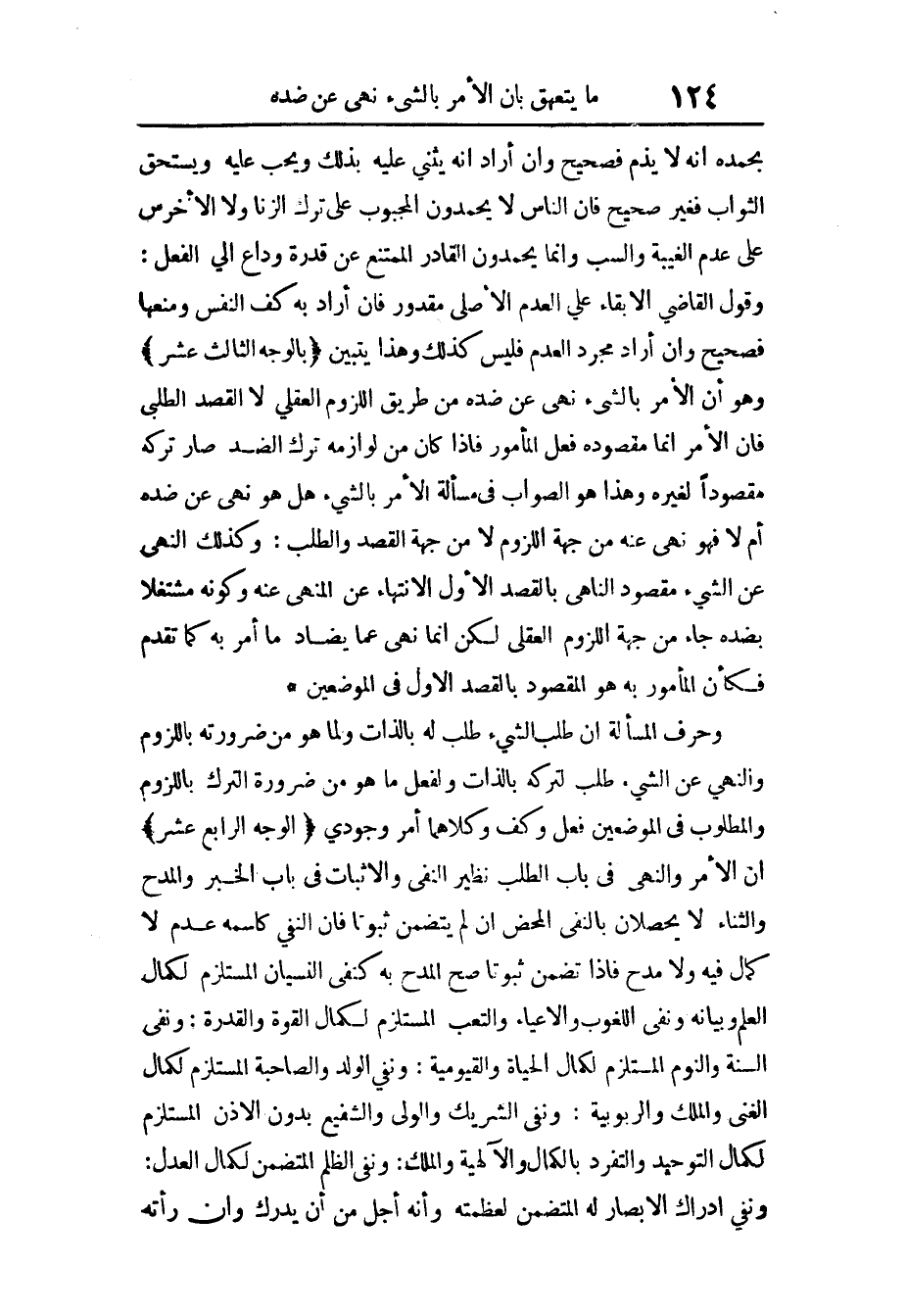 بِحَمْدِهِ أَنه لَا يذم فَصَحِيح وَإِن أَرَادَ أَنه يثني عَلَيْهِ بذلك وَيُحب عَلَيْهِ وَيسْتَحق الثَّوَاب فَغير صَحِيح فَإِن النَّاس لَا يحْمَدُونَ المحبوب على ترك الزِّنَا وَلَا الْأَخْرَس على عدم الْغَيْبَة والسب وَإِنَّمَا يحْمَدُونَ الْقَادِر الْمُمْتَنع عَن قدرَة وداع إِلَى الْفِعْل وَقَول القَاضِي الْإِبْقَاء على الْعَدَم الْأَصْلِيّ مَقْدُور فَإِن أَرَادَ بِهِ كف النَّفس ومنعها فَصَحِيح وَإِن أَرَادَ مجرّد الْعَدَم فَلَيْسَ كَذَلِك وَهَذَا يتَبَيَّن بِالْوَجْهِ الثَّالِث عشر وَهُوَ أَن الْأَمر بالشَّيْء نهي عَن ضِدّه من طَرِيق اللُّزُوم الْعقلِيّ لَا الْقَصْد الطلبي فَإِن الْأَمر إِنَّمَا مَقْصُود فعل الْمَأْمُور فَإِذا كَانَ من لوازمه ترك الضِّدّ صَار تَركه مَقْصُودا لغيره وَهَذَا هُوَ الصَّوَاب فِي مَسْأَلَة الْأَمر بالشَّيْء هَل هُوَ نهي عَن ضِدّه أم لَا فَهُوَ نهي عَنهُ من جِهَة اللُّزُوم لَا من جِهَة الْقَصْد والطلب وَكَذَلِكَ النَّهْي عَن الشَّيْء مَقْصُود الناهي بِالْقَصْدِ الأول الِانْتِهَاء عَن الْمنْهِي عَنهُ وَكَونه مشتغلا بضده جَاءَ من جِهَة اللُّزُوم الْعقلِيّ لَكِن إِنَّمَا نهى عَمَّا يضاد مَا أَمر بِهِ كَمَا تقدم فَكَأَن الْمَأْمُور بِهِ هُوَ الْمَقْصُود بِالْقَصْدِ الأول فِي الْمَوْضِعَيْنِ