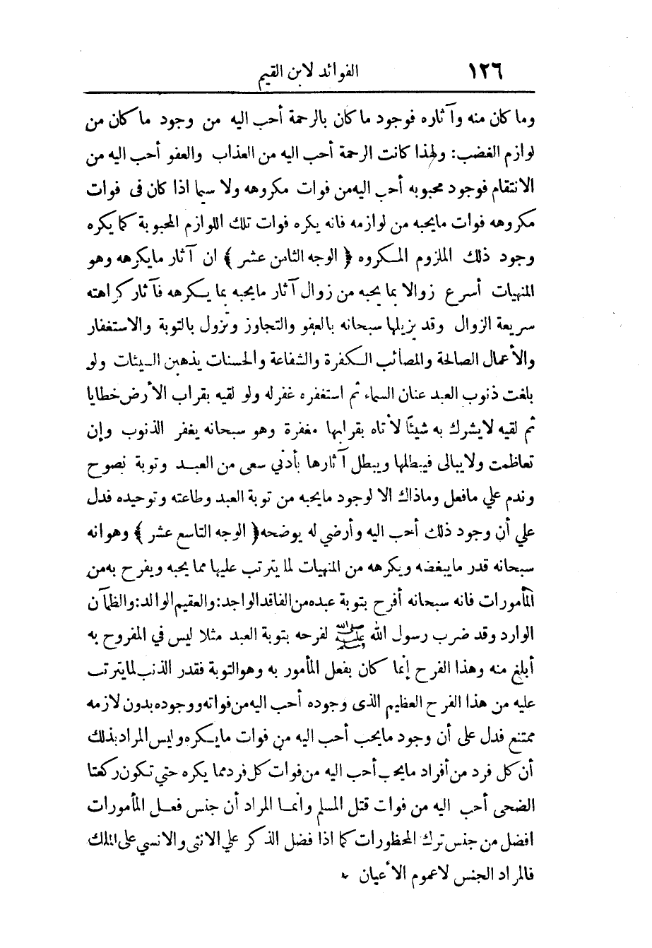 وَمَا كَانَ مِنْهُ وآثاره فوجود مَا كَانَ بِالرَّحْمَةِ أحب إِلَيْهِ من وجود مَا كَانَ من لَوَازِم الْغَضَب وَلِهَذَا كَانَت الرَّحْمَة أحب إِلَيْهِ من الْعَذَاب وَالْعَفو أحب إِلَيْهِ من الانتقام فوجود محبوبه أحب إِلَيْهِ من فَوَات مكروهه وَلَا سِيمَا إِذا كَانَ فِي فَوَات مكروهه فَوَات مَا يُحِبهُ من لوازمه فَإِنَّهُ يكره فَوَات تِلْكَ اللوازم المحبوبة كَمَا يكره وجود ذَلِك الْمَلْزُوم الْمَكْرُوه الْوَجْه الثَّامِن عشر أَن آثَار مَا يكرههُ وَهُوَ المنهيات أسْرع زوالا بِمَا يُحِبهُ من زَوَال آثَار مَا يُحِبهُ بِمَا يكرههُ فآثار كَرَاهَته سريعة الزَّوَال وَقد يزيلها سُبْحَانَهُ بِالْعَفو والتجاوز وتزول لتوبة وَالِاسْتِغْفَار والأعمال الصَّالِحَة والمصائب الْكَفَرَة والشفاعة والحسنات يذْهبن والسيئات وَلَو بلغت ذنُوب العَبْد عنان السَّمَاء ثمَّ استغفره غفر لَهُ وَلَو لقِيه بقراب الأَرْض خَطَايَا ثمَّ لقِيه لَا يُشْرك بِهِ شَيْئا لأتاه بقرابها مغْفرَة وَهُوَ سُبْحَانَهُ يغْفر الذُّنُوب وَإِن تعاظمت وَلَا يُبَالِي فيبطلها وَيبْطل آثارها بِأَدْنَى سعي من العَبْد وتوبة نصوح وَنَدم على مَا فعل وَمَا ذَاك إِلَّا لوُجُود مَا يُحِبهُ من تَوْبَة العَبْد وطاعته وتوحيده فدلّ على أَن وجود ذَلِك أحب إِلَيْهِ وأرضى لَهُ يُوضحهُ الْوَجْه التَّاسِع عشر وَهُوَ أَنه سُبْحَانَهُ قدر مَا يبغضه ويكرهه من المنهيات لما يَتَرَتَّب عَلَيْهَا مِمَّا يُحِبهُ ويفرح بِهِ من المأمورات فَإِنَّهُ سُبْحَانَهُ أفرح بتوبة عَبده من الفاقد الْوَاجِد والعقيم الْوَالِد والظمآن الْوَارِد وَقد ضرب رَسُول الله لفرحه بتوبة العَبْد مثلا لَيْسَ فِي المفروح بِهِ أبلغ مِنْهُ وَهَذَا الْفَرح إِنَّمَا كَانَ بِفعل الْمَأْمُور بِهِ وَهُوَ التَّوْبَة فَقدر الذَّنب لما يَتَرَتَّب عَلَيْهِ من هَذَا الْفَرح الْعَظِيم الَّذِي وجوده أحب إِلَيْهِ من فَوَاته ووجوده بِدُونِ لَازمه مُمْتَنع فَدلَّ على أَن وجود مَا يحب أحب إِلَيْهِ من فَوَات مَا يكره وَلَيْسَ المُرَاد بذلك أَن كل فَرد من أَفْرَاد مَا يحب أحب إِلَيْهِ من فَوَات كل فَرد مِمَّا يكره حَتَّى تكون رَكعَتَا الضُّحَى أحب إِلَيْهِ من فَوَات قتل الْمُسلم وَإِنَّمَا المُرَاد أَن جنس فعل المأمورات أفضل من جنس ترك الْمَحْظُورَات كَمَا إِذا فضل الذّكر على الْأُنْثَى والإنسي على الْملك فَالْمُرَاد الْجِنْس لَا عُمُوم الْأَعْيَان