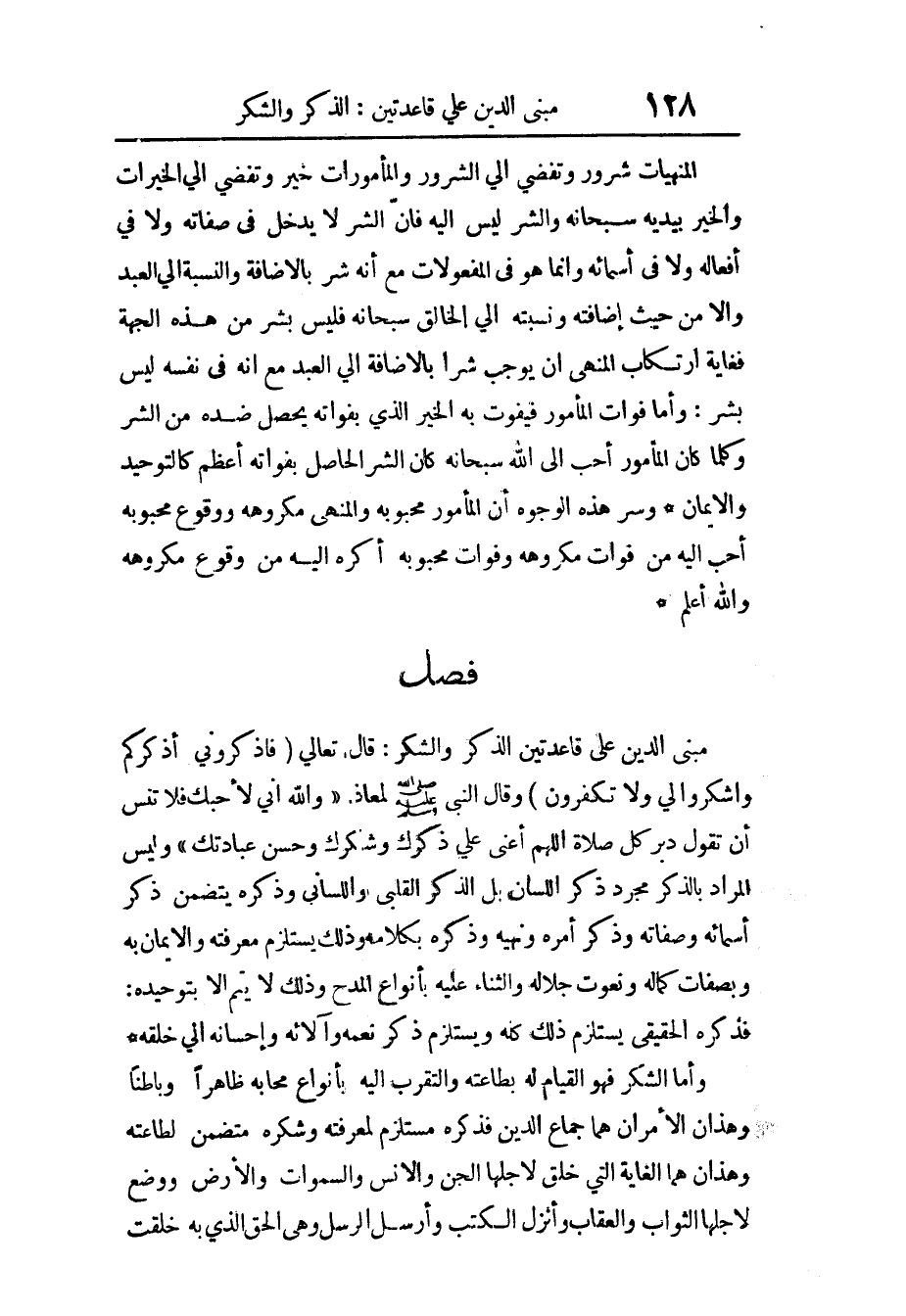 فصل مبْنى الدّين على قاعدتين الذّكر وَالشُّكْر قَالَ تَعَالَى