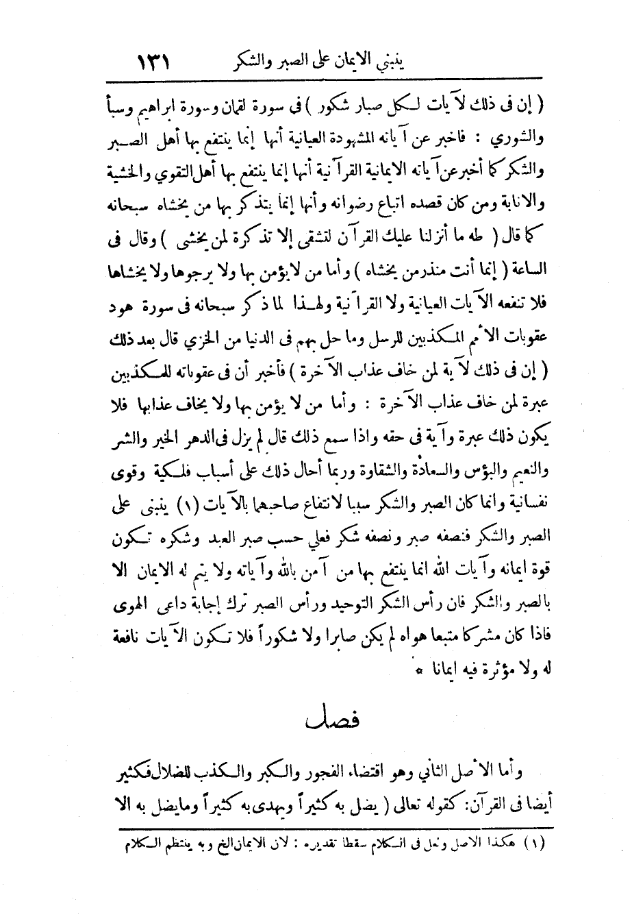 {إِنَّ فِي ذَلِكَ لَآياتٍ لِكُلِّ صَبَّارٍ شكور} فِي سُورَة لُقْمَان وَسورَة إِبْرَاهِيم وسبأ والشورى فَأخْبر عَن آيَاته المشهودة العيانية أَنَّهَا إِنَّمَا ينْتَفع بهَا أهل الصَّبْر وَالشُّكْر كَمَا أخبر عَن آيَاته الإيمانية القرآنية أَنَّهَا إِنَّمَا ينْتَفع بهَا أهل التَّقْوَى والخشية والإنابة وَمن كَانَ قَصده اتّباع رضوانه وَأَنَّهَا يتَذَكَّر بهَا من يخشاه سُبْحَانَهُ كَمَا قَالَ طه أَنْزَلْنَا عَلَيْكَ الْقُرْآنَ لِتَشْقَى إِلَّا تَذْكِرَةً لمن يخْشَى وَقَالَ فِي لساعة {إِنَّمَا أَنْتَ مُنْذِرُ من يخشاها} وَأما من لَا يُؤمن بهَا وَلَا يرجوها وَلَا يخشاها فَلَا تَنْفَعهُ الْآيَات العيانية وَلَا القرآنية وَلِهَذَا لما ذكر سُبْحَانَهُ فِي سُورَة هود عقوبات الْأُمَم المكذبين للرسل وَمَا حل بهم فِي الدُّنْيَا من الخزي قَالَ بعد ذَلِك {إِنَّ فِي ذَلِكَ لَآيَةً لِمَنْ خَافَ عَذَاب الْآخِرَة} فَأخْبر أَن عقوباته للمكذبين عِبْرَة لمن خَافَ عَذَاب الْآخِرَة وَأما من لَا يُؤمن بهَا وَلَا يخَاف عَذَابهَا فَلَا يكون ذَلِك عِبْرَة وَآيَة فِي حَقه اذا سمع ذَلِك قَالَ لم يزل فِي الدَّهْر الْخَيْر وَالشَّر وَالنَّعِيم والبؤس والسعادة والشقاوة وَرُبمَا أحَال ذَلِك على أَسبَاب فلكية وقوى نفسانية وَإِنَّمَا كَانَ الصَّبْر وَالشُّكْر سَببا لانتفاع صَاحبهمَا بِالْآيَاتِ يَنْبَنِي على الصَّبْر وَالشُّكْر فنصفه صَبر وَنصفه شكر فعلى حسب صَبر العَبْد وشكره تكون قُوَّة إيمَانه وآيات الله إِنَّمَا ينْتَفع بهَا من آمن بِاللَّه وَلَا يتم لَهُ الْإِيمَان إِلَّا بِالصبرِ وَالشُّكْر فَإِن رَأس الشُّكْر التَّوْحِيد وَرَأس الصَّبْر ترك إِجَابَة دَاعِي الْهوى فَإِذا كَانَ مُشْركًا مُتبعا هَوَاهُ لم يكن صَابِرًا وَلَا شكُورًا فَلَا تكون الْآيَات نافعة لَهُ وَلَا مُؤثرَة فِيهِ إِيمَانًا