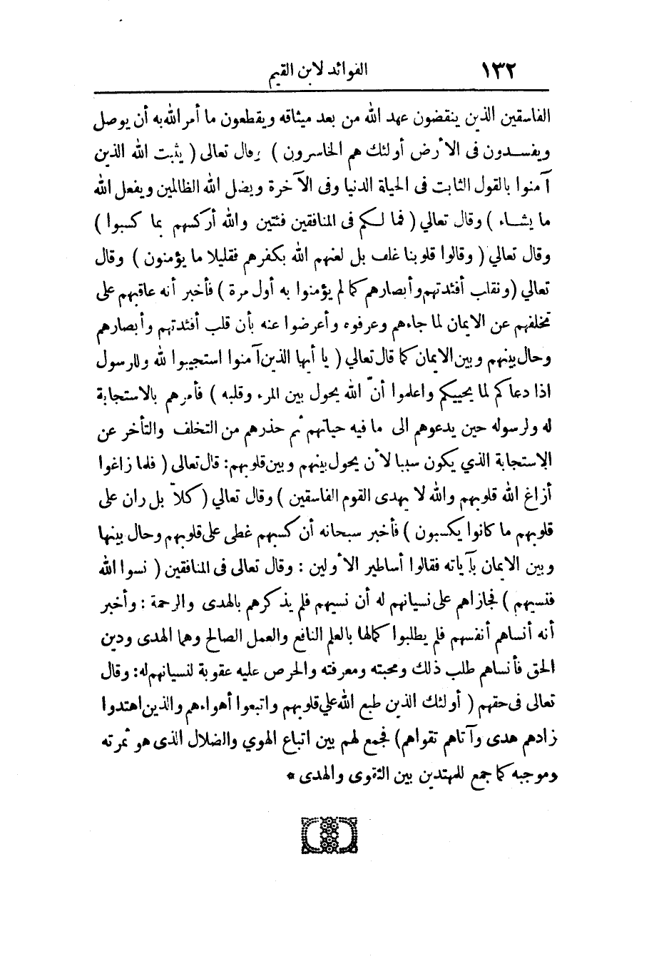 {الْفَاسِقين الَّذين ينقضون عَهْدَ اللَّهِ مِنْ بَعْدِ مِيثَاقِهِ وَيَقْطَعُونَ مَا أَمَرَ اللَّهُ بِهِ أَنْ يُوصَلَ وَيُفْسِدُونَ فِي الْأَرْضِ أُولَئِكَ هُمُ الْخَاسِرُونَ} وَقَالَ تَعَالَى {ُيثَبِّتُ اللَّهُ الَّذِينَ آمَنُوا بِالْقَوْلِ الثَّابِتِ فِي الْحَيَاةِ الدُّنْيَا وَفِي الْآخِرَةِ وَيُضِلُّ اللَّهُ الظَّالِمِينَ وَيَفْعَلُ اللَّهُ مَا يَشَاء} وَقَالَ تَعَالَى فَمَا لَكُمْ فِي الْمُنَافِقِينَ فِئَتَيْنِ وَاللَّهُ أَرْكَسَهُمْ بِمَا كسبوا وَقَالَ تَعَالَى {وَقَالُوا قُلُوبنَا غلف بل لعنهم الله بكفرهم فقليلا مَا يُؤمنُونَ} وَقَالَ تَعَالَى {وَنُقَلِّبُ أَفْئِدَتَهُمْ وَأَبْصَارَهُمْ كَمَا لَمْ يُؤْمِنُوا بِهِ أول مرّة} فَأخْبر أَنه عاقبهم على تخلفهم عَن الْإِيمَان لما جَاءَهُم وعرفوه وأعرضوا عَنهُ بِأَن قلب أفئدتهم وأبصارهم وَحَال بَينهم وَبَين الْإِيمَان كَمَا قَالَ تَعَالَى يَا أَيُّهَا الَّذِينَ آمَنُوا اسْتَجِيبُوا لِلَّهِ وَلِلرَّسُولِ إِذَا دَعَاكُمْ لِمَا يُحْيِيكُمْ وَاعْلَم أَنَّ اللَّهَ يَحُولُ بَيْنَ الْمَرْءِ وَقَلْبِهِ فَأَمرهمْ بالاستجابة لَهُ وَلِرَسُولِهِ حِين يَدعُوهُم إِلَى مَا فِيهِ حياتهم ثمَّ حذّرهم من التَّخَلُّف والتأخر عَن الاستجابة الَّذِي يكون سَببا لِأَن يحول بَينهم وَبَين قُلُوبهم قَالَ تَعَالَى {فَلَمَّا زَاغُوا أَزَاغَ اللَّهُ قُلُوبَهُمْ وَاللَّهُ لَا يَهْدِي الْقَوْمَ الْفَاسِقين} وَقَالَ تَعَالَى {كَلَّا بَلْ رَانَ عَلَى قُلُوبِهِمْ مَا كَانُوا يَكْسِبُونَ} فَأخْبر سُبْحَانَهُ أَن كسبهم غطى على قُلُوبهم وَحَال بَينهَا وَبَين الْإِيمَان بآياته فَقَالُوا أَسَاطِيرُ الْأَوَّلِينَ وَقَالَ تَعَالَى فِي الْمُنَافِقين {نَسُوا اللَّهَ فنسيهم} فجازاهم على نسيانهم لَهُ أَن نسيهم فَلم يذكرهم بِالْهدى وَالرَّحْمَة وَأخْبر أَنه أنساهم أنفسهم فَلم يطلبوا كمالها بِالْعلمِ النافع وَالْعَمَل الصَّالح وهما الْهدى وَدين الْحق فأنساهم طلب ذَلِك ومحبته ومعرفته والحرص عَلَيْهِ عُقُوبَة لنسيانهم لَهُ وَقَالَ تَعَالَى فِي حقّهم {أُولَئِكَ الَّذِينَ طَبَعَ اللَّهُ عَلَى قُلُوبِهِمْ وَاتَّبَعُوا أَهْوَاءَهُمْ وَالَّذِينَ اهْتَدَوْا زَادَهُمْ هُدىً وآتاهم تقواهم} فَجمع لَهُم بَين اتّباع الْهوى والضلال الَّذِي هُوَ ثَمَرَته وموجبه كَمَا جمع للمهتدين بَين التَّقْوَى وَالْهدى