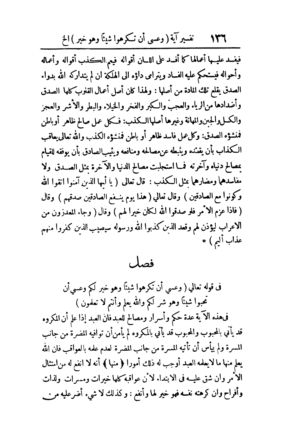فِي هَذِه الْآيَة عدَّة حكم وأسرار ومصالح للْعَبد فَإِن العَبْد إِذا علم أَن الْمَكْرُوه قد يَأْتِي بالمحبوب والمحبوب قد يَأْتِي بالمكروه لم يَأْمَن أَن توافيه الْمضرَّة من جَانب المسرّة وَلم ييأس أَن تَأتيه المسرة من جَانب الْمضرَّة لعدم علمه بالعواقب فَإِن الله يعلم مِنْهَا مَالا يُعلمهُ العَبْد وَأوجب لَهُ ذَلِك أمورا مِنْهَا أَنه لَا أَنْفَع لَهُ من امْتِثَال الْأَمر وَإِن شقّ عَلَيْهِ فِي الِابْتِدَاء لِأَن عواقبه كلهَا خيرات ومسرات ولذات وأفراح وَإِن كرهته نَفسه فَهُوَ خير لَهَا وأنفع وَكَذَلِكَ لَا شَيْء أضرّ عَلَيْهِ من