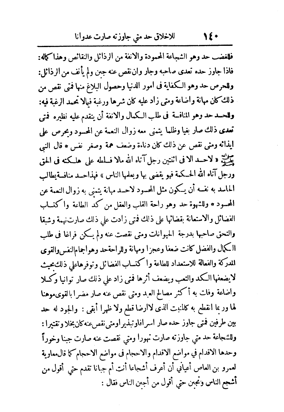 فللغضب حد وَهُوَ الشجَاعَة المحمودة والأنفة من الرذائل والنقائص وَهَذَا كَمَاله فَإِذا جَاوز حَده تعدى صَاحبه وجار وَإِن نقص عَنهُ جبن وَلم يأنف من الرذائل وللحرص حد وَهُوَ الْكِفَايَة فِي أُمُور الدُّنْيَا وَحُصُول الْبَلَاغ مِنْهَا فَمَتَى نقص من ذَلِك كَانَ مهانة وإضاعة وَمَتى زَاد عَلَيْهِ كَانَ شَرها ورغبة فِيمَا لَا تحمد الرَّغْبَة فِيهِ وللحسد حد وَهُوَ المنافسة فِي طلب الْكَمَال والأنفة أَن يتَقَدَّم عَلَيْهِ نَظِيره فَمَتَى تعدى ذَلِك صَار بغيا وظلما يتَمَنَّى مَعَه زَوَال النِّعْمَة عَن الْمَحْسُود ويحرص على إيذائه وَمَتى نقص عَن ذَلِك كَانَ دناءة وَضعف همة وَصغر نفس قَالَ النَّبِي لَا حسد إِلَّا فِي اثْنَيْنِ رجل آتَاهُ الله مَالا فَسَلَّطَهُ على هَلَكته فِي الْحق وَرجل آتَاهُ الله الْحِكْمَة فَهُوَ يقْضِي بهَا وَيعلمهَا النَّاس فَهَذَا حسد مُنَافَسَة يُطَالب الْحَاسِد بِهِ نَفسه أَن يكون مثل الْمَحْسُود لَا حسد مهانة يتَمَنَّى بِهِ زَوَال النِّعْمَة عَن الْمَحْسُود وللشهوة حد وَهُوَ رَاحَة الْقلب وَالْعقل من كد الطَّاعَة واكتساب الْفَضَائِل والاستعانة بقضائها على ذَلِك فَمَتَى زَادَت على ذَلِك صَارَت نهمة وشبقا والتحق صَاحبهَا بِدَرَجَة الْحَيَوَانَات وَمَتى نقصت عَنهُ وَلم يكن فراغا فِي طلب الْكَمَال وَالْفضل كَانَت ضعفا وعجزا ومهانة وللراحة حد وَهُوَ إجمام النَّفس والقوى المدركة والفعالة للاستعداد للطاعة واكتساب الْفَضَائِل وتوفرها على ذَلِك بِحَيْثُ لَا يضعفها الكد والتعب ويضعف أَثَرهَا فَمَتَى زَاد على ذَلِك صَار توانيا وكسلا وإضاعة وَفَاتَ بِهِ أَكثر مصَالح العَبْد وَمَتى نقص عَنهُ صَار مضرا بالقوى موهنا لَهَا وَرُبمَا انْقَطع بِهِ كالمنبتِّ الَّذِي لَا أَرضًا قطع وَلَا ظهر أبقى والجود لَهُ حد بَين طرفين فَمَتَى جَاوز حَده صَار إسرافا وتبذيرا أَو مَتى نقص عَنهُ كَانَ بخلا وتقتيرا وللشجاعة حد مَتى جاوزته صَارَت تهوّرا وَمَتى نقصت عَنهُ صَارَت جبنا وخورا وَحدهَا الْإِقْدَام فِي مَوَاضِع الْإِقْدَام والإحجام فِي مَوَاضِع الإحجام كَمَا قَالَ مُعَاوِيَة لعَمْرو بن الْعَاصِ أعياني أَن أعرف أشجاعا أَنْت أم جَبَانًا تقدم حَتَّى أَقُول من أَشْجَع النَّاس وتجبن حَتَّى أَقُول من أجبن النَّاس فَقَالَ