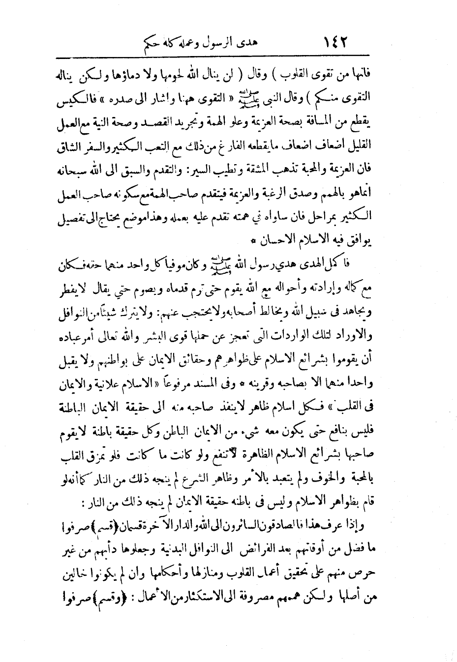 فأكمل الْهَدْي هدي رَسُول الله وَكَانَ موفيا كل وَاحِد مِنْهُمَا حَقه فَكَانَ مَعَ كَمَاله وإرادته وأحواله مَعَ الله يقوم حَتَّى تَرِم قدماه ويصوم حَتَّى يُقَال لَا يفْطر ويجاهد فِي سَبِيل الله ويخالط أَصْحَاب وَلَا يحتجب عَنْهُم وَلَا يتْرك شَيْئا من النَّوَافِل والأوراد لتِلْك الواردات الَّتِي تعجز عَن حملهَا قوى الْبشر وَالله تَعَالَى أَمر عباده أَن يقومُوا بشرائع الْإِسْلَام على ظواهرهم وحقائق الْإِيمَان على بواطنهم وَلَا يقبل وَاحِدًا مِنْهُمَا إِلَّا بِصَاحِبِهِ وقرينه وَفِي الْمسند مَرْفُوعا الْإِسْلَام عَلَانيَة وَالْإِيمَان فِي الْقلب فَكل إِسْلَام ظَاهر لَا ينفذ صَاحبه مِنْهُ إِلَى حَقِيقَة الْإِيمَان الْبَاطِنَة فَلَيْسَ بِنَافِع حَتَّى يكون مَعَه شَيْء من الْإِيمَان الْبَاطِن وكل حَقِيقَة باطنة لَا يقوم صَاحبهَا بشرائع الْإِسْلَام الظَّاهِرَة لَا تَنْفَع وَلَو كَانَت مَا كَانَت فَلَو تمزق الْقلب بالمحبة وَالْخَوْف وَلم يتعبد بِالْأَمر وَظَاهر الشَّرْع لم ينجّه ذَلِك من النَّار كَمَا أَنه لَو قَامَ بظواهر الْإِسْلَام وَلَيْسَ فِي بَاطِنه حَقِيقَة الْإِيمَان لم ينجّه من النَّار