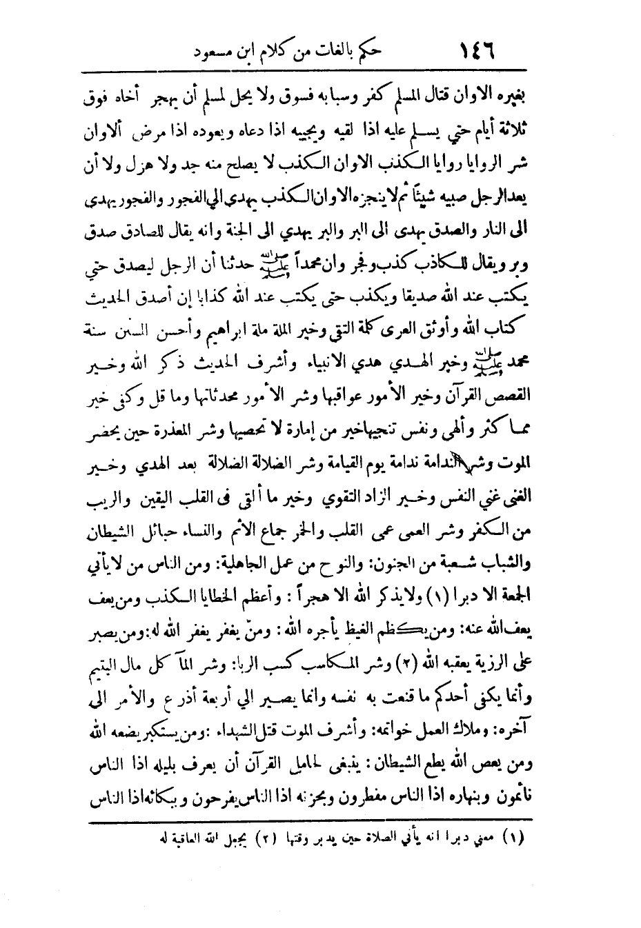 بِغَيْرِهِ أَلا وَإِن قتال الْمُسلم كفر وسبابه فسوق وَلَا يحل لمُسلم أَن يهجر أَخَاهُ فَوق ثَلَاثَة أَيَّام حَتَّى يسلّم عَلَيْهِ إِذا لقِيه ويجيبه إِذا دَعَاهُ ويعوده إِذا مرض أَلا وَإِن شرّ الروايا روايا الْكَذِب أَلا وَإِن الْكَذِب لَا يصلح مِنْهُ جد وَلَا هزل وَلَا أَن يعد الرجل صَبِيه شَيْئا ثمَّ لَا يُنجزهُ أَلا وَإِن الْكَذِب يهدي إِلَى الْفُجُور والفجور يهدي إِلَى النَّار والصدق يهدي إِلَى الْبر وَالْبر يهدي إِلَى الْجنَّة وَأَنه يُقَال للصادق صدق وبر وَيُقَال للكاذب كذب وفجر وَأَن مُحَمَّدًا حَدثنَا أَن الرجل ليصدق حَتَّى يكْتب عِنْد الله صدّيقا ويكذب حَتَّى يكْتب عِنْد الله كذّابا إِن أصدق الحَدِيث كتاب الله وأوثق العرى كلمة التقى وَخير الْملَّة مِلَّة إِبْرَاهِيم وَأحسن السّنَن سنة مُحَمَّد وَخير الْهَدْي هدي الْأَنْبِيَاء وأشرف الحَدِيث ذكر الله وَخير الْقَصَص الْقُرْآن وَخير الْأُمُور عواقبها وَشر الْأُمُور محدثاتها وَمَا قل وَكفى خير مِمَّا كثر وألهى وَنَفس تنجيها خير من إِمَارَة لَا تحصيها وَشر المعذرة حِين يحضر الْمَوْت وَشر الندامة ندامة يَوْم الْقِيَامَة وَشر الضَّلَالَة الضَّلَالَة بعد الْهوى وَخير الْغنى غنى النَّفس وَخير الزَّاد التَّقْوَى وَخير مَا ألقِي فِي الْقلب الْيَقِين والريب من الْكفْر وَشر الْعَمى عمى الْقلب وَالْخمر جماع الْإِثْم وَالنِّسَاء حبائل الشَّيْطَان والشباب شُعْبَة من الْجُنُون وَالنوح من عمل الْجَاهِلِيَّة وَمن النَّاس من لَا يَأْتِي الْجُمُعَة إِلَّا دبرا وَلَا يذكر الله إِلَّا هجرا وَأعظم الْخَطَايَا الْكَذِب وَمن يعف يعف الله عَنهُ وَمن يَكْظِم الغيظ يأجره الله وَمن يغْفر يغْفر الله لَهُ وَمن يصبر على الرزية يعقبه الله وَشر المكاسب كسب الرِّبَا وَشر المأكل مَال الْيَتِيم وَإِنَّمَا يَكْفِي أحدكُم مَا قنعت بِهِ نَفسه وَإِنَّمَا يصير إِلَى أَرْبَعَة أَذْرع وَالْأَمر إِلَى آخِره وملاك الْعَمَل خواتمه وأشرف الْمَوْت قتل الشُّهَدَاء وَمن يستكبر يَضَعهُ الله وَمن يعْص الله يطع الشَّيْطَان يَنْبَغِي لحامل الْقُرْآن أَن يعرف بليله إِذا النَّاس نائمون وبنهاره إِذا النَّاس مفطرون وبحزنه إِذا النَّاس يفرحون وببكائه إِذا النَّاس