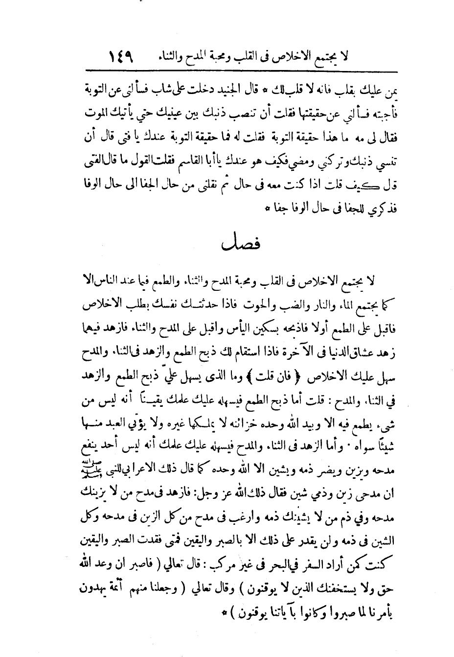 فصل لَا يجْتَمع الْإِخْلَاص فِي الْقلب ومحبة الْمَدْح وَالثنَاء والطمع فِيمَا عِنْد