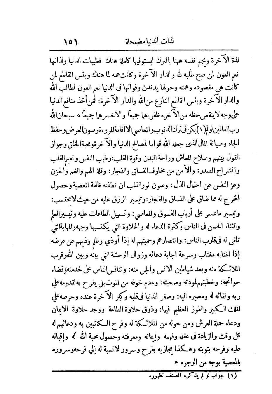 لَذَّة الْآخِرَة ويجم نَفسه هَهُنَا بِالتّرْكِ ليستوفيها كَامِلَة هُنَاكَ فطيبات الدُّنْيَا ولذاتها نعم العون لمن صَحَّ طلبه لله وَالدَّار الْآخِرَة وَكَانَت همه لما هُنَاكَ وَبئسَ الْقَاطِع لمن كَانَت هِيَ مَقْصُوده وهمته وحولها يدندن وفواتها فِي الدُّنْيَا نعم العون لطَالب الله وَالدَّار الْآخِرَة وَبئسَ الْقَاطِع النازع من الله وَالدَّار الْآخِرَة فَمن أَخذ مَنَافِع الدُّنْيَا على وَجه لَا ينقص حَظه من الْآخِرَة ظفر بهما جَمِيعًا وَإِلَّا خسرهما جَمِيعًا سُبْحَانَ الله رب الْعَالمين لَو لم يكن فِي ترك الذُّنُوب والمعاصي إِلَّا إِقَامَة الْمُرُوءَة وصون الْعرض وَحفظ الجاه وصيانة المَال الَّذِي جعله الله قواما لمصَالح الدُّنْيَا وَالْآخِرَة ومحبة الْخلق وَجوَار القَوْل بَينهم وَصَلَاح المعاش وراحة الْبدن وَقُوَّة الْقلب وَطيب النَّفس ونعيم الْقلب وانشراح الصَّدْر والأمن من مخاوف الْفُسَّاق والفجار وَقلة الْهم وَالْغَم والحزن وَعز النَّفس عَن احْتِمَال الذل وصون نور الْقلب أَن تطفئه ظلمَة الْمعْصِيَة وَحُصُول الْمخْرج لَهُ مِمَّا ضَاقَ على الْفُسَّاق والفجار وتيسر الرزق عَلَيْهِ من حَيْثُ لَا يحْتَسب وتيسير مَا عسر على أَرْبَاب الفسوق والمعاصي وتسهيل الطَّاعَات عَلَيْهِ وتيسير الْعلم وَالثنَاء الْحسن فِي النَّاس وَكَثْرَة الدُّعَاء لَهُ والحلاوة الَّتِي يكتسبها وَجهه المهابة الَّتِي تلقى لَهُ فِي قُلُوب النَّاس وانتصارهم وحميتهم لَهُ إِذا أوذي وظلم وذبهم عَن عرضه إِذا اغتابه مغتاب وَسُرْعَة إِجَابَة دُعَائِهِ وَزَوَال الوحشة الَّتِي بَينه وَبَين الله وَقرب الْمَلَائِكَة مِنْهُ وَبعد شياطين الْإِنْس وَالْجِنّ مِنْهُ وتنافس النَّاس على خدمته وَقَضَاء حَوَائِجه وخطبتهم لمودته وصحبته وَعدم خَوفه من الْمَوْت بل يفرح بِهِ لقدومه على ربه ولقائه لَهُ ومصيره إِلَيْهِ وَصغر الدُّنْيَا فِي قلبه وَكبر الْآخِرَة عِنْده وحرصه على الْملك الْكَبِير والفوز الْعَظِيم فِيهَا وذوق حلاوة الطَّاعَة وَوجد حلاوة الْإِيمَان وَدُعَاء حَملَة الْعَرْش وَمن حوله من الْمَلَائِكَة لَهُ وَفَرح الْكَاتِبين بِهِ ودعائهم لَهُ كل وَقت وَالزِّيَادَة فِي عقله وفهمه وإيمانه ومعرفته وَحُصُول محبَّة الله لَهُ وإقباله عَلَيْهِ وفرحه بتويته وَهَكَذَا يجازيه بفرح وسرور لَا نِسْبَة لَهُ إِلَى فرحه وسروره بالمعصية بِوَجْه من الْوُجُوه