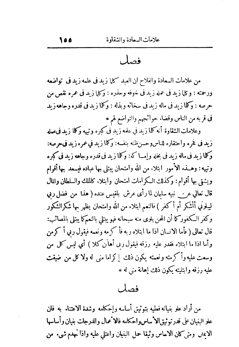 وعلامات الشقاوة أَنه كلما زيد فِي علمه زيد فِي كبره وتيهه وَكلما زيد فِي عمله زيد فِي فخره واحتقاره للنَّاس وَحسن ظَنّه بِنَفسِهِ وَكلما زيد فِي عمره زيد قي حرصه وَكلما زيد فِي مَاله زيد فِي بخله وإمساكه وَكلما زيد فِي قدره وجاهه زيد فِي كبره وتيهه وَهَذِه الْأُمُور ابتلاء من الله وامتحان يَبْتَلِي بهَا عباده فيسعد بهَا أَقوام ويشفى بهَا أَقوام وَكَذَلِكَ الكرامات امتحان وابتلاء كالملك وَالسُّلْطَان وَالْمَال قَالَ تَعَالَى عَن نبيه سُلَيْمَان لما رأى عرش بلقيس عِنْده هَذَا مِنْ فَضْلِ رَبِّي لِيَبْلُوَنِي أَأَشْكُرُ أم أكفر فالنعم ابتلاء من الله وامتحان يظْهر بهَا شكر الشكُور وَكفر الكفور كَمَا أَن المحن بلوى مِنْهُ سُبْحَانَهُ فَهُوَ يَبْتَلِي بِالنعَم كَمَا يَبْتَلِي بالمصائب قَالَ تَعَالَى فَأَمَّا الْأِنْسَانُ إِذَا مَا ابْتَلاهُ رَبُّهُ فَأَكْرَمَهُ وَنَعَّمَهُ فَيَقُولُ رَبِّي أَكْرَمَنِ وَأَمَّا إِذَا مَا ابْتَلاهُ فَقَدَرَ عَلَيْهِ رِزْقَهُ فَيَقُولُ رَبِّي أَهَانَنِ كلا أَي لَيْسَ كل من وسعت عَلَيْهِ وأكرمته وَنعمته يكون ذَلِك إِكْرَاما مني لَهُ وَلَا كل من ضيّقت عَلَيْهِ رزقه وابتليته يكون ذَلِك إهانة مني لَهُ