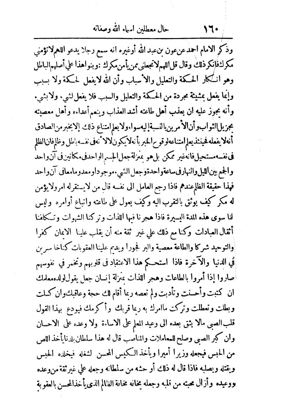 وَذكر الإِمَام أَحْمد عَن عون بن عبد الله أَو غَيره أَنه سمع رجلا يَدْعُو الْهم لَا تؤمني مكرك فَأنْكر ذَلِك وَقَالَ قل اللَّهُمَّ لَا تجعلني مِمَّن يَأْمَن مكرك وبنوا ذَلِك على أصلهم الْبَاطِل وَهُوَ إِنْكَار الْحِكْمَة وَالتَّعْلِيل والأسباب وَأَن الله لَا يفعل لحكمة وَلَا سَبَب وَإِنَّمَا يفعل بِمَشِيئَة مُجَرّدَة من الحكم وَالتَّعْلِيل وَالسَّبَب فَلَا يفعل لشَيْء وَلَا بِشَيْء وَأَنه لَا يجوز عَلَيْهِ أَن يعذب أهل طَاعَته أَشد الْعَذَاب وينعّم أعداءه وَأهل مَعْصِيَته بجزيل الثَّوَاب وَأَن الْأَمريْنِ بِالنِّسْبَةِ إِلَيْهِ سَوَاء وَلَا يعلم امْتنَاع ذَلِك إِلَّا بِخَبَر من الصَّادِق أَنه لَا يَفْعَله فَحِينَئِذٍ يعلم امْتِنَاعه لوُقُوع الْخَبَر بِأَنَّهُ لَا يكون لَا لِأَنَّهُ فِي نَفسه بَاطِل وظلم فَإِن الظُّلم فِي نَفسه مُسْتَحِيل فَإِنَّهُ غير مُمكن بل هُوَ بِمَنْزِلَة جعل الْجِسْم الْوَاحِد فِي مكانين فِي آن وَاحِد وَالْجمع بَين اللَّيْل وَالنَّهَار فِي سَاعَة وَاحِدَة وَجعل الشَّيْء مَوْجُودا ومعدوما مَعًا فِي آن وَاحِد فَهَذَا حَقِيقَة الظُّلم عِنْدهم فَإِذا رَجَعَ الْعَامِل إِلَى نَفسه قَالَ من لَا يسْتَقرّ لَهُ أَمر وَلَا يُؤمن لَهُ مكر كَيفَ يوثق بالتقرّب إِلَيْهِ وَكَيف يعول على طاعنه واتّباع أوامره وَلَيْسَ لنا سوى هَذِه الْمدَّة الْيَسِيرَة فَإِذا هجرنا فِيهَا اللَّذَّات وَتَركنَا الشَّهَوَات وتكلفتا أثقال الْعِبَادَات وَكُنَّا مَعَ ذَلِك على غير ثِقَة مِنْهُ أَن يقلب علينا الْإِيمَان كفرا والتوحيد شركا وَالطَّاعَة مَعْصِيّة وَالْبر فجورا ويديم علينا الْعُقُوبَات كُنَّا خاسرين فِي الدُّنْيَا وَالْآخِرَة فَإِذا استحكم هَذَا الِاعْتِقَاد فِي قُلُوبهم وتخمّر فِي نُفُوسهم صَارُوا إِذا أمروا بالطاعات وهجر اللَّذَّات بِمَنْزِلَة إِنْسَان جعل يَقُول لوَلَده معلمك إِن كتبت وأحسنت وتأدبت وَلم تعصه رُبمَا أَقَامَ لَك حجَّة وعاقبك وَإِن كسلت وَبَطلَت وتعطلت وَتركت مَا أَمرك بِهِ رُبمَا قربك وأكرمك فيودع بِهَذَا القَوْل قلب الصَّبِي مَا لَا يَثِق بعده إِلَى وَعِيد الْمعلم على الْإِسَاءَة وَلَا وعده على الْإِحْسَان وَإِن كبر الصَّبِي وَصلح للمعاملات والمناصب قَالَ لَهُ هَذَا سُلْطَان بلدنا يَأْخُذ اللص من الْحَبْس فَيَجْعَلهُ وزيرا أَمِيرا وَيَأْخُذ الكيّس المحسن لشغله فيخلّده الْحَبْس ويقتله ويصلبه فَإِذا قَالَ لَهُ ذَلِك أَو حشه سُلْطَانه وَجعله على غير ثِقَة من وعده ووعيده وأزال محبته من قلبه وَجعله يخافه مَخَافَة الظَّالِم الَّذِي يَأْخُذ المحسن بالعقوبة