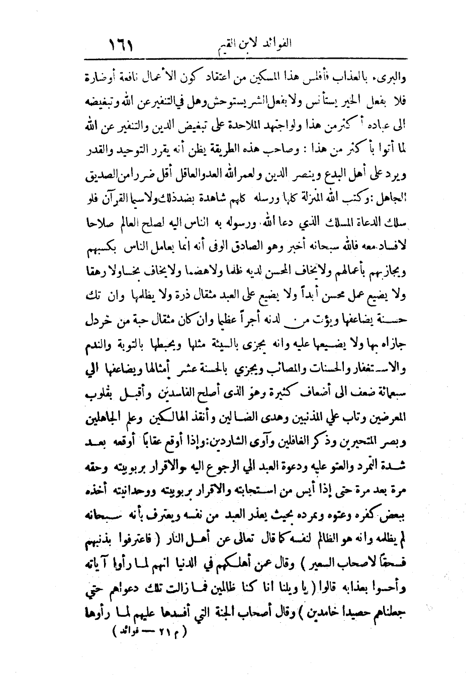 والبريء بِالْعَذَابِ فأفلس هَذَا الْمِسْكِين من اعْتِقَاد كَون الْأَعْمَال نافعة أَو ضارة فَلَا بِفعل الْخَيْر يسْتَأْنس وَلَا بِفعل الشَّرّ يستوحش وَهل فِي التنفير عَن الله وتبغيضه إِلَى عباده أَكثر من هَذَا وَلَو اجْتهد الْمَلَاحِدَة على تبغيض الدّين والتنفير عَن الله لما أَتَوا بِأَكْثَرَ من هَذَا وَصَاحب هَذِه الطَّرِيقَة يظنّ أَنه يُقرر التَّوْحِيد وَالْقدر وَيرد على أهل الْبدع وينصر الدّين ولعمر الله الْعَدو الْعَاقِل أقل ضَرَرا من الصّديق الْجَاهِل وَكتب الله الْمنزلَة كلهَا وَرُسُله كلهم شَهَادَة بضد ذَلِك وَلَا سِيمَا الْقُرْآن فَلَو سلك الدعاة المسلك الَّذِي دَعَا الله وَرَسُوله بِهِ النَّاس إِلَيْهِ لصلح الْعَالم صلاحا لَا فَسَاد مَعَه فَالله سُبْحَانَهُ أخبر وَهُوَ الصَّادِق الوفي أَنه إِنَّمَا يُعَامل النَّاس بكسبهم ويجازيهم بأعمالهم وَلَا يخَاف المحسن ليده ظلما وَلَا هضما وَلَا يخَاف بخسا وَلَا رهقا وَلَا يضيع عمل محسن أبدا وَلَا يضيع على العَبْد مِثْقَال ذرة لَا يظلمها وَإِن تَكُ حَسَنَة يُضَاعِفهَا وَيُؤْت من لَدنه أجرا عَظِيما وَإِن كَانَ مِثْقَال حَبَّة من خَرْدَل جازاه بهَا وَلَا يضيعها عَلَيْهِ وَأَنه يَجْزِي بِالسَّيِّئَةِ مثلهَا ويحبطها بِالتَّوْبَةِ والندم وَالِاسْتِغْفَار والحسنات والمصائب وَيجْزِي بِالْحَسَنَة عشر أَمْثَالهَا ويضاعفها إِلَى سَبْعمِائة ضعف إِلَى أَضْعَاف كَثِيرَة وَهُوَ الَّذِي أصلح الفاسدين وَأَقْبل بقلوب المعرضين وَتَابَ على المذنبين وَهدى الضَّالّين وأنقذ الهالكين وَعلم الْجَاهِلين وبصر المتحيزين وَذكر الغافلين وآوى الشاردين وَإِذا أوقع عقَابا أوقعه بعد شدَّة التمرد والعتو عَلَيْهِ ودعوة العَبْد إِلَى الرُّجُوع إِلَى إِلَيْهِ وَالْإِقْرَار بربوبيته وَحقه مرّة بعد مرّة حَتَّى إِذا يأس من استجابته وَالْإِقْرَار بربوبيته ووحدانيته أَخذه بِبَعْض كفره وعتوّه وتمرّده بِحَيْثُ يعْذر العَبْد من نَفسه ويعترف بِأَنَّهُ سُبْحَانَهُ لم يَظْلمه وَأَنه هُوَ الظَّالِم لنَفسِهِ كَمَا قَالَ تَعَالَى عَن أهل النَّار فَاعْتَرَفُوا بِذَنْبِهِمْ فَسُحْقاً لِأَصْحَابِ السَّعِيرِ وَقَالَ عَمَّن أهلكهم فِي الدُّنْيَا أَنهم لما رَأَوْا آيَاته وأحسوا حصيدا بعذابه قَالُوا يَا وَيْلَنَا إِنَّا كُنَّا ظَالِمِينَ فَمَا زَالَتْ تِلْكَ دَعْوَاهُمْ حَتَّى جَعَلْنَاهُمْ حَصِيداً خَامِدِينَ وَقَالَ أَصْحَاب الْجنَّة الَّتِي أفسدها عَلَيْهِم لما رأوها