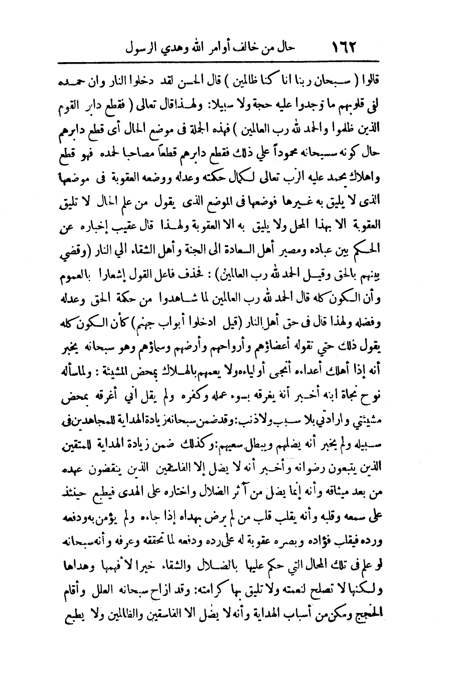 {قَالُوا} سُبْحَانَ رَبِّنَا إِنَّا كُنَّا ظَالِمِينَ قَالَ الْحسن لقد دخلُوا النَّار وإنّ حَمده لفي قُلُوبهم مَا وجدوا عَلَيْهِ حجَّة وَلَا سَبِيلا وَلِهَذَا قَالَ تَعَالَى نقطع دَابِرُ الْقَوْمِ الَّذِينَ ظَلَمُوا وَالْحَمْدُ لِلَّهِ رَبِّ الْعَالَمِينَ فَهَذِهِ الْجُمْلَة فِي مَوضِع الْحَال أَي قطع دابرهم حَال كَونه سُبْحَانَهُ مَحْمُودًا على ذَلِك فَقطع دابرهم قطعا مصاحبا لحمده فَهُوَ قطع وإهلاك يحمد عَلَيْهِ الرب تَعَالَى لَكمَا حكمته وعدله وَوَضعه الْعقُوبَة فِي موضعهَا الَّذِي لَا يَلِيق بِهِ غَيرهَا فوضعها فِي الْموضع الَّذِي يَقُول من علم الْحَال لَا تلِيق الْعقُوبَة إِلَّا بِهَذَا الْمحل وَلَا يَلِيق بِهِ إِلَّا الْعقُوبَة وَلِهَذَا قَالَ عقيب إخْبَاره عَن الحكم بَين عباده ومصير أهل السَّعَادَة إِلَى الْجنَّة وَأهل الشَّقَاء إِلَى النَّار وَقُضِيَ بَيْنَهُمْ بِالْحَقِّ وَقِيلَ الْحَمد لله رب الْعَالَمِينَ فَحذف فَاعل القَوْل إشعارا بِالْعُمُومِ وَأَن الْكَوْن كُله قَالَ الْحَمْدُ لِلَّهِ رَبِّ الْعَالَمِينَ لما شاهدوا من حِكْمَة الْحق وعدله وفضله وَلِهَذَا قَالَ فِي حق أهل النَّار قِيلَ ادْخُلُوا أَبْوَابَ جَهَنَّم كَأَن الْكَوْن كُله يَقُول ذَلِك حَتَّى تَقوله أعضاؤهم وأرواحهم وأرضهم وسماؤهم وَهُوَ سُبْحَانَهُ بِخَبَر أَنه إِذا هلك أعداءه أنجى أولياءه وَلَا يعمهم بِالْهَلَاكِ بمحض الْمَشِيئَة وَلما سَأَلَهُ نوح نجاة ابْنه أخبر أَنه يغرقه بِسوء عمله وكفره وَلم يقل إِنِّي أغرقه بمحض مشيئتي وإرادتي بِلَا سَبَب وَلَا ذَنْب وَقد ضمن سُبْحَانَهُ زِيَادَة الْهِدَايَة للمجاهدين فِي سبله وَلم يخبر أَنه يضلهم وَيبْطل سَعْيهمْ وَكَذَلِكَ ضمن زِيَادَة الْهِدَايَة لِلْمُتقين الَّذين يتبعُون رضوانه وَأخْبر أَنه لَا يضل إِلَّا الْفَاسِقين الَّذين ينقضون عَهده من بعد ميثاقه وَأَنه إِنَّمَا يضل من آثر الضلال وَاخْتَارَهُ على الْهدى فيطبع حِينَئِذٍ على سَمعه وَقَلبه وَأَنه يقلب قلب من لم يرض بهداه إِذا جَاءَهُ وَلم يُؤمن بِهِ وَدفعه وردّه فيقلب فُؤَاده وبصره عُقُوبَة لَهُ على رده وَدفعه لما تحَققه وعرفه وَأَنه سُبْحَانَهُ لَو علم فِي تِلْكَ الْمحَال الَّتِي حكم عَلَيْهَا بالضلال والشقاء خيرا لأفهمها وهداها وَلكنهَا لَا تصلح لنعمته وَلَا تلِيق بهَا كرامته وَقد أزاح سُبْحَانَهُ الْعِلَل وَأقَام الْحجَج ومكّن من أَسبَاب الْهِدَايَة وَأَنه لَا يضل إِلَّا الْفَاسِقين والظالمين وَلَا يطبع