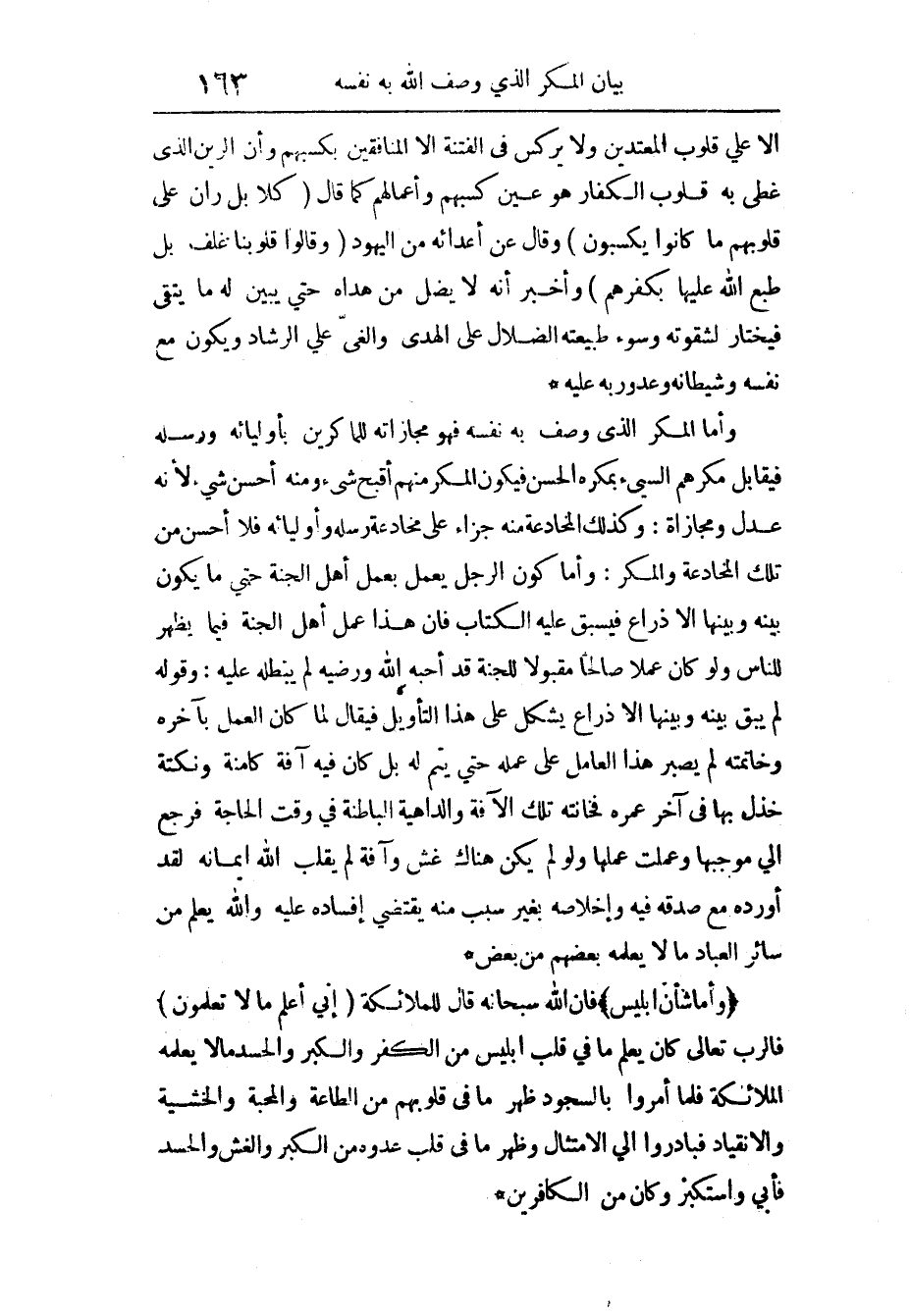 وَأما الْمَكْر الَّذِي وصف بِهِ نَفسه فَهُوَ مجازاته للماكرين بأوليائه وَرُسُله فيقابل مَكْرهمْ السيء بمكره الْحسن فَيكون الْمَكْر مِنْهُم أقبح شَيْء وَمِنْه أحسن شيءلأنه عدل ومجازاة وَكَذَلِكَ المخادعة مِنْهُ جَزَاء على مخادعة رسله أوليائه فَلَا أحسن من تِلْكَ المخادعة وَالْمَكْر وَأما كَون الرجل يعْمل بِعَمَل أهل الْجنَّة حَتَّى مَا يكون بَينه وَبَينهَا إِلَّا ذِرَاع فَيَسْبق عَلَيْهِ الْكتاب فَإِن هَذَا عمل أهل الْجنَّة فِيمَا يظْهر للنَّاس وَلَو كَانَ عملا صَالحا مَقْبُولًا للجنة قد أحبه الله ورضيه لم يُبطلهُ عَلَيْهِ وَقَوله لم يبْق بَينه وَبَينهَا إِلَّا ذِرَاع يشكل على هَذَا التَّأْوِيل فَيُقَال لما كَانَ الْعَمَل بِآخِرهِ وخاتمته لم يصبر هَذَا الْعَامِل على عمله حَتَّى يتم لَهُ بل كَانَ فِيهِ آفَة كامنة ونكتة خذل بهَا فِي آخر عمره فخانته تِلْكَ الآفة والداهية والباطنة فِي وَقت الْحَاجة فَرجع إِلَى مُوجبهَا وعملت عَملهَا وَلَو لم يكن هُنَاكَ غش وَآفَة لم يقلب الله إيمَانه لقد أوردهُ مَعَ صدقه فِيهِ وإخلاصه بِغَيْر سَبَب مِنْهُ يَقْتَضِي إفساده عَلَيْهِ وَالله يعلم من سَائِر الْعباد مَا لَا يُعلمهُ بَعضهم من بعض
