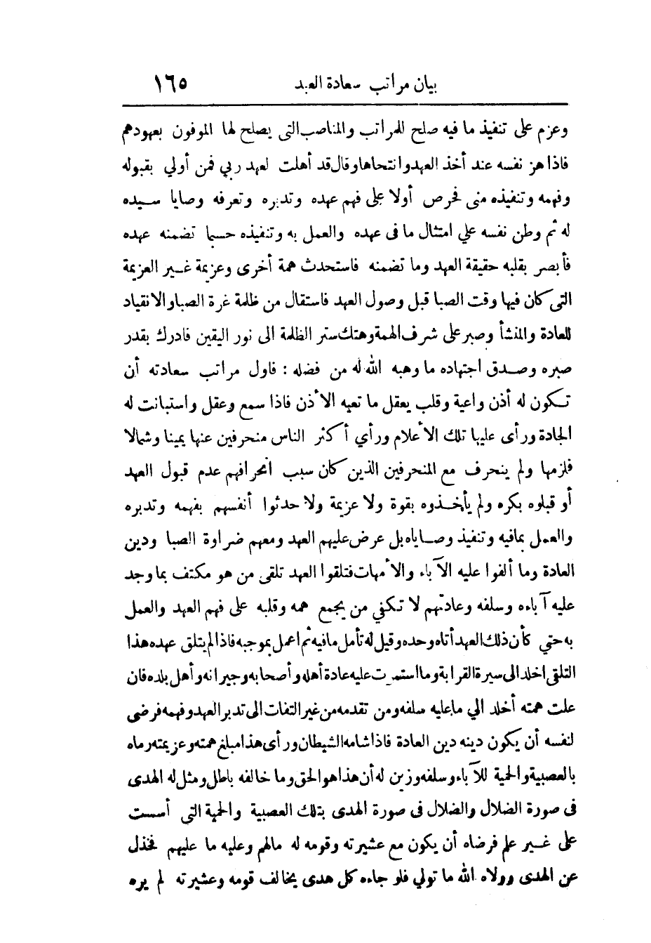 وعزم على تَنْفِيذ مَا فِيهِ صلح للمراتب والمناصب الَّتِي يصلح لَهَا الموفون بعهودهم فَإِذا هز نَفسه عِنْد أَخذ الْعَهْد وانتحاها وَقَالَ قد أُهِّلْت لعهد رَبِّي فَمن أولى بقبوله وفهمه وتنفيذه مني فحرص أَولا على فهم عَهده وتدبره وتعرفه وَصَايَا سَيّده لَهُ ثمَّ وطّن نَفسه على امْتِثَال مَا فِي عَهده وَالْعَمَل بِهِ وتنفيذه حَسْبَمَا تضمنه عَهده فأبصر بِقَلْبِه حَقِيقَة الْعَهْد وَمَا تضمنه فاستحدث همة أُخْرَى وعزيمة غير الْعَزِيمَة الَّتِي كَانَ فِيهَا وَقت الصِّبَا قبل وُصُول الْعَهْد فاستقال من ظلمَة غرَّة الصِّبَا والانقياد للْعَادَة والمنشأ وصبر على شرف الهمة وهتك ستر الظلمَة إِلَى نور الْيَقِين فَأدْرك بِقدر صبره وَصدق اجْتِهَاده مَا وهبه الله لَهُ من فَضله فَأول مَرَاتِب سعادته أَن تكون لَهُ أذن وَاعِيَة وقلب يعقل مَا تعيه الْأذن فَإِذا سمع وعقل واستبانت لَهُ الجادة وَرَأى عَلَيْهَا تِلْكَ الْأَعْلَام وَرَأى أَكثر النَّاس منحرفين عَنْهَا يَمِينا وَشمَالًا فلزمها وَلم ينحرف مَعَ المنحرفين الَّذين كَانَ سَبَب انحرافهم عدم قبُول الْعَهْد أَو قبلوه بكره وَلم يأخذوه بِقُوَّة وَلَا عَزِيمَة وَلَا حدثوا أنفسهم بفهمه وتدبره وَالْعَمَل بِمَا فِيهِ وتنفيذ وَصَايَاهُ بل عرض غيهم الْعَهْد وَمَعَهُمْ ضراوة الصِّبَا وَدين الْعَادة وَمَا ألفوا عَلَيْهِ الْآبَاء والأمهات فتلقوا الْعَهْد تلقي من هُوَ مكتف بِمَا وجد عَلَيْهِ آباءه وسلفه وعادتهم لَا تَكْفِي من يجمع همه وَقَلبه على فهم الْعَهْد وَالْعَمَل بِهِ حَتَّى كَأَن ذَلِك الْعَهْد أَتَاهُ وَحده وَقيل لَهُ تَأمل مَا فِيهِ ثمَّ اعْمَلْ بِمُوجبِه فَإِذا لم يتلق عَهده هَذَا التلقي أخلد إِلَى سير الْقَرَابَة وَمَا استمرت عَلَيْهِ عَادَة أَهله وَأَصْحَابه وجيرانه وَأهل بَلَده فَإِن علت همته أخلد إِلَى مَا عَلَيْهِ سلفه وَمن تقدمه من غير الْتِفَات إِلَى تدبر الْعَهْد وفهمه فَرضِي لنَفسِهِ أَن يكون دينه دين الْعَادة فَإِذا شامه الشَّيْطَان وَرَأى هَذَا مبلغ همته وعزيمته رَمَاه بالعصبية وَالْحمية للآباء وسلفه وزيّن لَهُ أَن هَذَا هُوَ الْحق وَمَا خَالفه بَاطِل وَمثل لَهُ الْهدى فِي صُورَة الضلال والضلال فِي صُورَة الْهدى بِتِلْكَ العصبية وَالْحمية الَّتِي أسست على غير علم فرضاه أَن يكون مَعَ عشيرته وَقَومه لَهُ مَا لَهُم وَعَلِيهِ مَا عَلَيْهِم فخذل عَن الْهدى وولاه الله مَا تولّى فَلَو جَاءَهُ كل هدى يُخَالف قومه وعشيرته لم يره