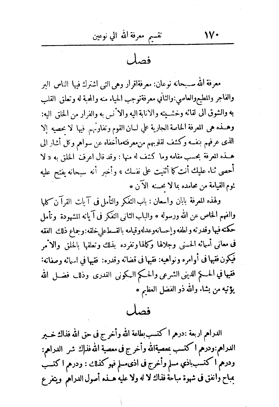 ولهذه الْمعرفَة بَابَانِ واسعان بَاب التفكّر والتأمّل فِي آيَات الْقُرْآن كلهَا والفهم الْخَاص عَن الله وَرَسُوله وَالْبَاب الثَّانِي التفكّر فِي آيَاته المشهودة وَتَأمل حكمته فِيهَا وَقدرته ولطفه وإحسانه وعدله وقيامه بِالْقِسْطِ على خلقه وجماع ذَلِك الْفِقْه فِي مَعَاني أَسْمَائِهِ الْحسنى وجلالها وكمالها وتفرّده بذلك وتعلّقها بالخلق وَالْأَمر فَيكون فَقِيها فِي أوامره ونواهيه فَقِيها فِي قَضَائِهِ وَقدره فَقِيها فِي أَسْمَائِهِ وَصِفَاته فَقِيها فِي الحكم الديني الشَّرْعِيّ وَالْحكم الكوني القدري وَذَلِكَ فَضْلُ اللَّهِ يُؤْتِيهِ مَنْ يَشَاءُ وَاللَّهُ ذُو الْفَضْلِ الْعَظِيمِ