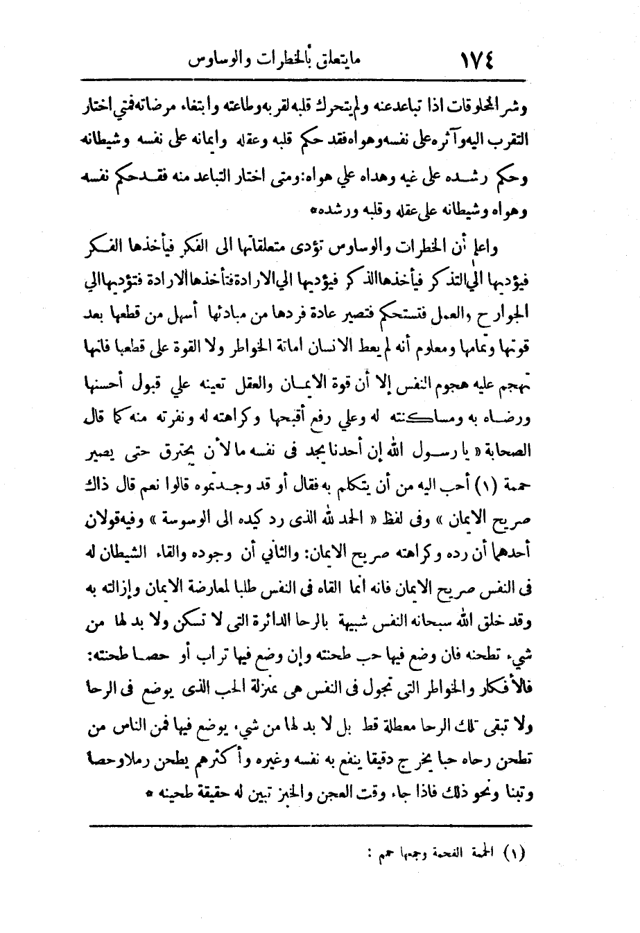 وَأعلم أَن الخاطرات والوساوس تُؤدِّي متعلقاتها إِلَى الْفِكر فيأخذها الْفِكر فيؤديها إِلَى التَّذَكُّر فيأخذها الذّكر فيؤديها إِلَى الْإِرَادَة فتأخذها الْإِرَادَة فتؤديها إِلَى الْجَوَارِح وَالْعَمَل فتستحكم فَتَصِير عَادَة فرّدها من مبادئها أسهل من قطعهَا بعد قوتها وتمامها وَمَعْلُوم أَنه لم يُعْط الْإِنْسَان إماتة الخواطر وَلَا الْقُوَّة على قطعهَا فَإِنَّهَا تهجم عَلَيْهِ هجوم النَّفس إِلَّا أَن قُوَّة الْإِيمَان وَالْعقل تعينه على قبُول أحْسنهَا وَرضَاهُ بِهِ ومساكنته لَهُ وعَلى رفع أقبحها وكراهته لَهُ نفرته مِنْهُ كَمَا قَالَ الصَّحَابَة يَا رَسُول الله إِن أَحَدنَا يجد فِي نَفسه مَا لِأَن يَحْتَرِق حَتَّى يصير حممة أحب إِلَيْهِ من أَن يتَكَلَّم بِهِ فَقَالَ أَو قد وجدتموه قَالُوا نعم قَالَ ذَاك صَرِيح الْإِيمَان وَفِي لفظ الْحَمد لله الَّذِي رد كَيده إِلَى الوسوسة وَفِيه قَولَانِ أَحدهمَا أَن رده وكراهيته صَرِيح الْإِيمَان وَالثَّانِي أَن وجوده وإلقاء الشَّيْطَان لَهُ فِي النَّفس صَرِيح الْإِيمَان فَإِنَّهُ إِنَّمَا أَلْقَاهُ فِي النَّفس طلبا لمعارضة الْإِيمَان وإزالته بِهِ وَقد خلق الله سُبْحَانَهُ النَّفس شَبيهَة بالرحا الدائرة الَّتِي لَا تسكن وَلَا بُد لَهَا من شَيْء تطحنه فَإِن وضع فِيهَا حب طحنته وَإِن وضع فِيهَا تُرَاب أَو حصا طحنته فلأفكار والخواطر الَّتِي تجول فِي النَّفس هِيَ بِمَنْزِلَة الْحبّ الَّذِي يوضع فِي الرحا وَلَا تبقى تِلْكَ الرحا معطلة قطّ بل لَا بُد لَهَا من شَيْء يوضع فِيهَا فَمن النَّاس من تطحن رحاه حبا يخرج دَقِيقًا ينفع بِهِ نَفسه وَغَيره وَأَكْثَرهم يطحن رملا وحصا وتبنا وَنَحْو ذَلِك فَإِذا جَاءَ وَقت العجن وَالْخبْز تبيّن لَهُ حَقِيقَة طحينه