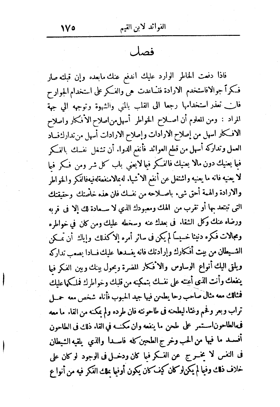 فكرا جوّالا فاستخدم الْإِرَادَة فتساعدت هِيَ والفكر على اسْتِخْدَام الْجَوَارِح فَإِن تعذّر استخدامها رجعا إِلَى الْقلب بالمني والشهوة وتوجهه إِلَى جِهَة المُرَاد وَمن الْمَعْلُوم أَن إصْلَاح الخواطر أسهل من إصْلَاح الأفكار وَإِصْلَاح الأفكار أسهل من إصْلَاح الإرادات وَإِصْلَاح الإرادات أسهل من تدارك فَسَاد الْعَمَل وتداركه أسهل من قطع العوائد فأنفع الدَّوَاء أَن تشغل نَفسك بالفكر فِيمَا يَعْنِيك دون مَالا يَعْنِيك فالفكر فِيمَا لَا يَعْنِي بَاب كل شَرّ وَمن فكّر فِيمَا لَا يعنيه فَاتَهُ مَا يعنيه واشتغل عَن أَنْفَع الْأَشْيَاء لَهُ بِمَا لَا مَنْفَعَة لَهُ فِيهِ فالفكر والخواطر والإرادة والهمة أَحَق شَيْء بإصلاحه من نَفسك فَإِن هَذِه خاصتك وحقيقتك الَّتِي تبتعد بهَا أَو تقرب من إلهك ومعبودك الَّذِي لَا سَعَادَة لَك إِلَّا فِي قربه وَرضَاهُ عَنْك وكل الشَّقَاء فِي بعْدك عَنهُ وَسخطه عَلَيْك وَمن كَانَ فِي خواطره ومجالات فكره دنيئا خسيسا لم يكن فِي سَائِر أمره إِلَّا كَذَلِك وَإِيَّاك أَن تمكّن الشَّيْطَان من بَيت أفكارك وإرادتك فَإِنَّهُ يُفْسِدهَا عَلَيْك فَسَادًا يصعب تَدَارُكه ويلقي إِلَيْك أَنْوَاع الوساوس والأفكار المضرّة ويحول بَيْنك وَبَين الْفِكر فِيمَا ينفعك وَأَنت الَّذِي أعنته على نَفسك بتمكينه من قَلْبك وخواطرك فملكها عَلَيْك فمثالك مَعَه مِثَال صَاحب رَحا يطحن فِيهَا جيّد الْحُبُوب فَأَتَاهُ شخص مَعَه حمل تُرَاب وبعر وفحم وغثاء ليطحنه فِي طاحونته فَإِن طرده وَلم يُمكنهُ من إِلْقَاء مَا مَعَه فِي الطاحون اسْتمرّ على طحن مَا يَنْفَعهُ وَإِن مكنه فِي إِلْقَاء ذَلِك فِي الطاحون أفسد مَا فِيهَا من الْحبّ وَخرج الطحين كُله فَاسِدا وَالَّذِي يلقيه الشَّيْطَان فِي النَّفس لَا يخرج عَن الْفِكر فِيمَا كَانَ وَدخل الْوُجُود لَو كَانَ على خلاف وَذَلِكَ وَفِيمَا لم يكن لَو كَانَ كَيفَ كَانَ يكون أَو فِيمَا يملك الْفِكر فِيهِ من أَنْوَاع