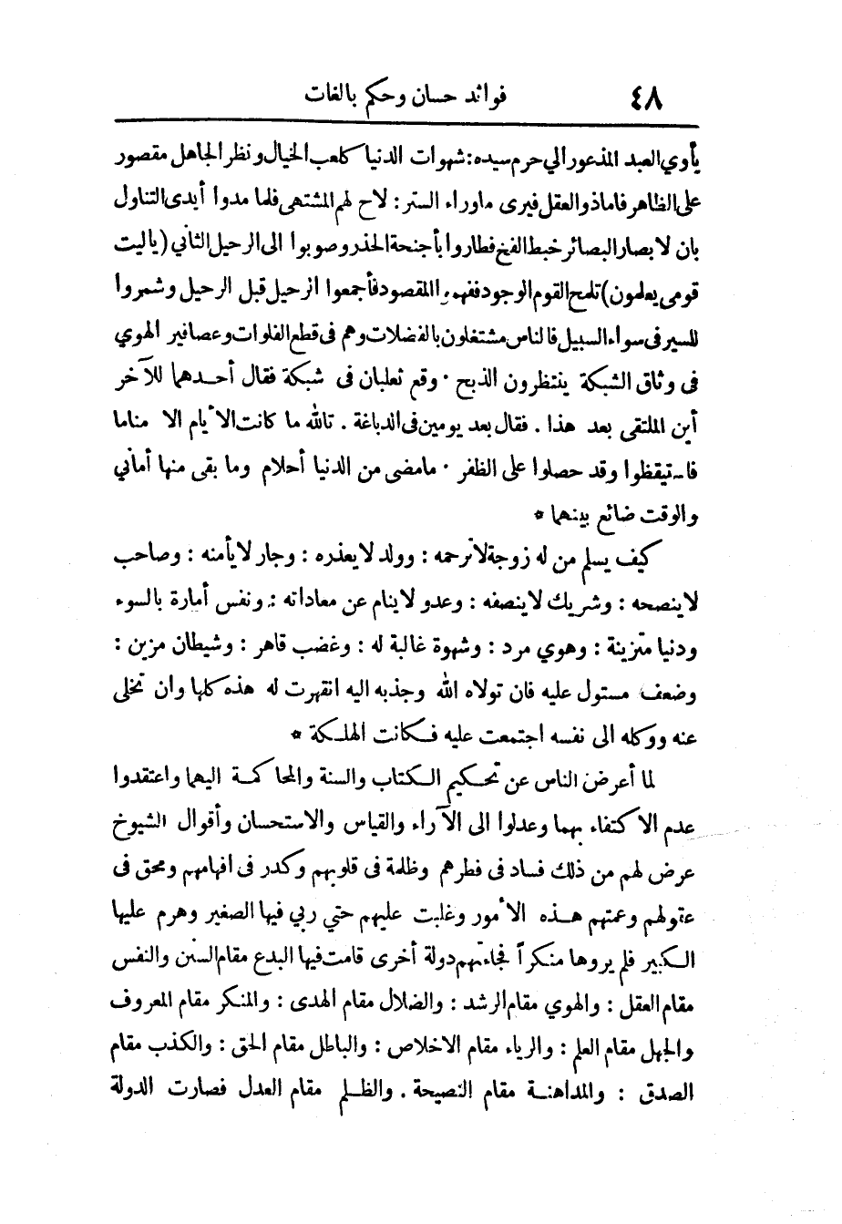 يأوي العَبْد المذعور إِلَى حرم سَيّده سَيّده شهوات الدُّنْيَا كلعب الخيال وَنظر الْجَاهِل مَقْصُور على الظَّاهِر فَأَما ذُو الْعقل فَيرى مَا ووراء السّتْر لَاحَ لَهُم المشتهَى فَلَمَّا مدوا أَيدي التَّنَاوُل بِأَن لابصار البصائر خبط الفخ فطاروا بأجنحة الحذر وصوبوا إِلَى الرحيل الثَّانِي ياليت قومِي يعلمُونَ تلمح الْقَوْم الْوُجُود ففهموا الْمَقْصُود فَأَجْمعُوا الرحيل قبل الرحيل وشمروا للسير فِي سَوَاء السَّبِيل فَالنَّاس مشتغلون بالفضلات وهم فِي قطع الفلوات وعصافير الْهوى فِي وثاق الشبكة ينتظرون الذّبْح وَقع ثعلبان فِي شبكة فَقَالَ أَحدهمَا للْآخر أَيْن الْمُلْتَقى بعد هَذَا فَقَالَ بعد يَوْمَيْنِ فِي الدباغة تالله مَا كَانَت الْأَيَّام الا مناما فليستيقظوا وَقد حصلوا على الظفر مَا مضى من الدُّنْيَا أَحْلَام وَمَا بَقِي مِنْهَا أماني وَالْوَقْت ضائع بَينهمَا