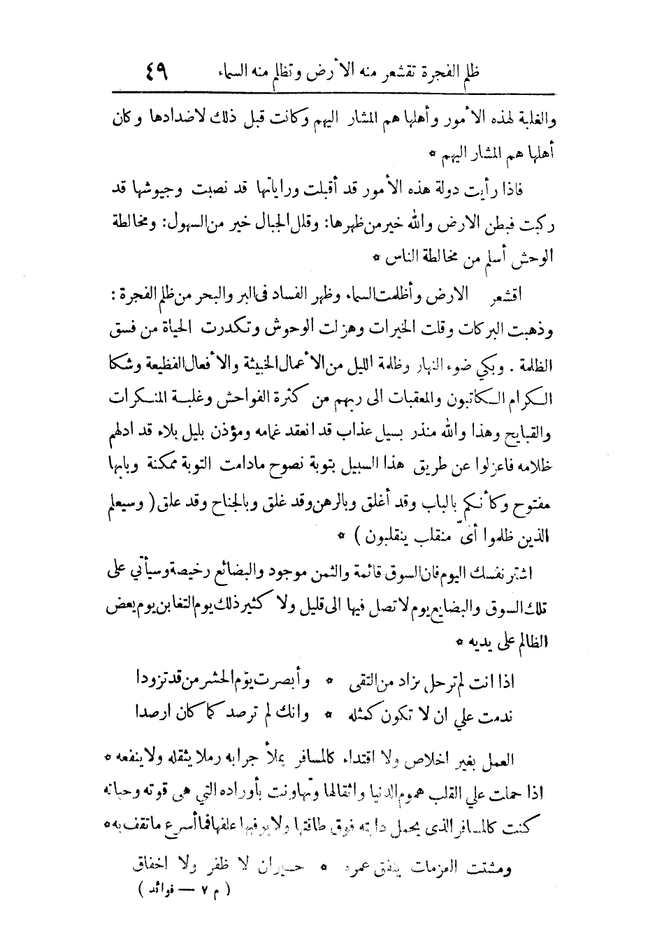 اقشعرّت الأَرْض وأظلمت السَّمَاء وَظهر الْفساد فِي الْبر وَالْبَحْر من ظلم الفجرة وَذَهَبت البركات وقلّت الْخيرَات وهُزلت الوحوش وتكدرت الْحَيَاة من فسق الظلمَة وَبكى ضوء النَّهَار وظلمة اللَّيْل من الْأَعْمَال الخبيثة وَالْأَفْعَال الفظيعة وشكا الْكِرَام الكاتبون والمعقبات إِلَى رَبهم من كَثْرَة الْفَوَاحِش وَغَلَبَة الْمُنْكَرَات والقبايح وَهَذَا وَالله مُنْذر بسيل عَذَاب قد انْعَقَد غمامه ومؤذن بلَيْل بلَاء قد ادلهمّ ظلامه فاعزلوا عَن طَرِيق هَذَا السَّبِيل بتوبة نصوح مَا دَامَت التَّوْبَة مُمكنَة وبابها مَفْتُوح وكأنكم بِالْبَابِ وَقد أغلق وبالرهن وَقد غلق وبالجناح وَقد علق {وَسَيَعْلَمُ الَّذِينَ ظَلَمُوا أَيَّ مُنْقَلَبٍ يَنْقَلِبُون}
