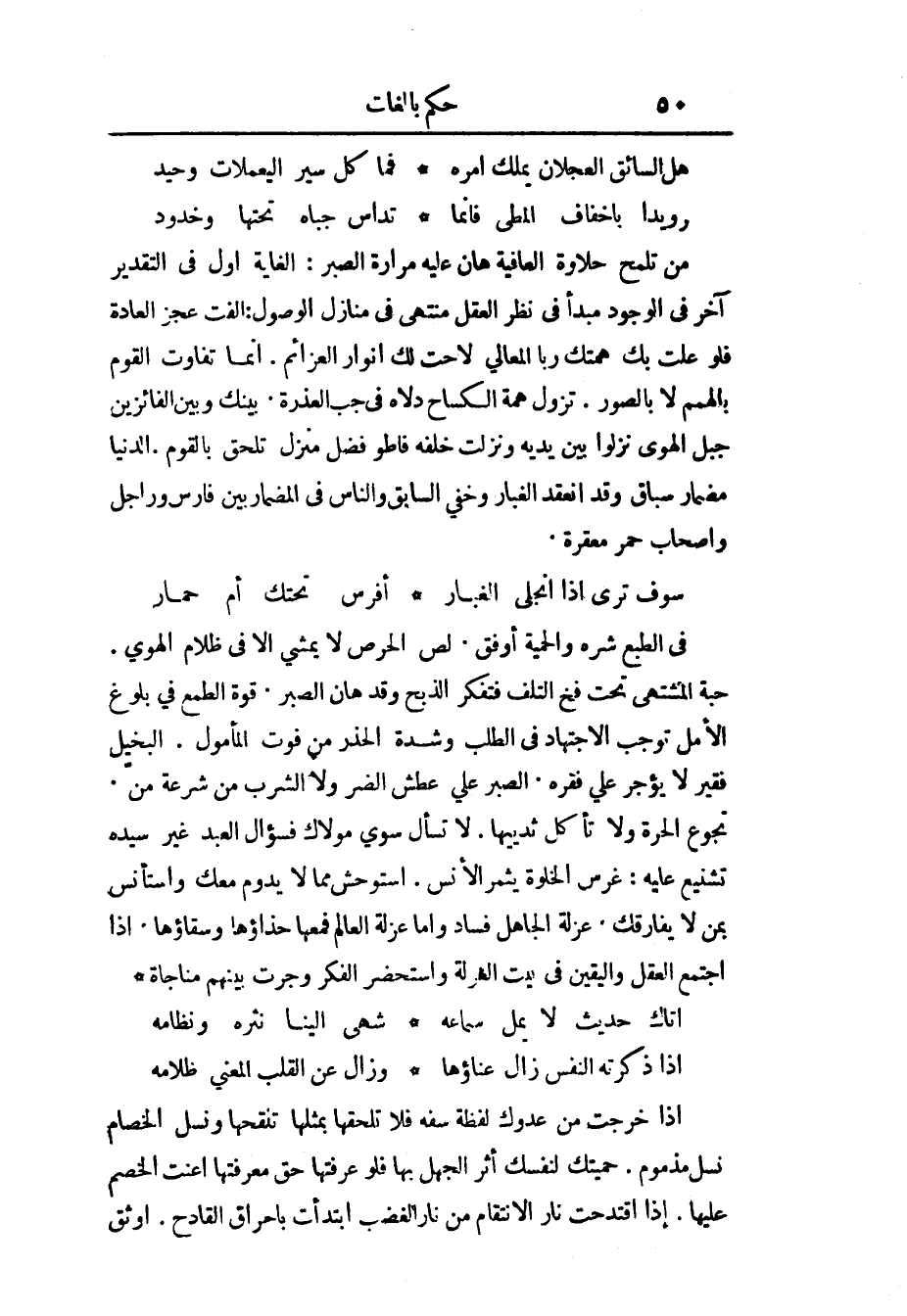 من تلمح حلاوة الْعَافِيَة هان عَلَيْهِ مرَارَة الصَّبْر الْغَايَة أول فِي التَّقْدِير آخر فِي الْوُجُود مبدأ فِي نظر الْعقل مُنْتَهى فِي منَازِل الْوُصُول ألفت عجز الْعَادة فَلَو علت بك همّتك رَبًّا الْمَعَالِي لاحت لَك أنوار العزائم إِنَّمَا تفَاوت الْقَوْم بالهمم لَا بالصور تَزُول همة الكساح دلاه فِي جب الْعذرَة بَيْنك وَبَين الفائزين جبل الْهوى نزلُوا بَين يَدَيْهِ وَنزلت خَلفه فاطو فضل منزل تلْحق بالقوم الدُّنْيَا مضمار سباق وَقد انْعَقَد الْغُبَار وخفي السَّابِق وَالنَّاس فِي الْمِضْمَار بَين فَارس وراجل وَأَصْحَاب حمر معقرة