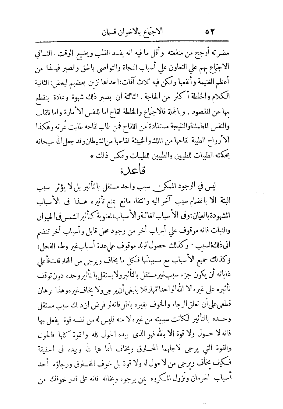 لَيْسَ فِي الْوُجُود الْمُمكن سَبَب وَاحِد مُسْتَقل بالتأثير بل لَا يُؤثر سَبَب الْبَتَّةَ إِلَّا بانضمام سَبَب آخر إِلَيْهِ وَانْتِفَاء مَانع يمْنَع تَأْثِيره هَذَا فِي الْأَسْبَاب المشهودة بالعيان وَفِي الْأَسْبَاب الغائبة والأسباب المعنوية كتأثير الشَّمْس فِي الْحَيَوَان والنبات فَإِنَّهُ مَوْقُوف على أَسبَاب أخر من وجود مَحل قَابل وَأَسْبَاب أخر تنضم إِلَى ذَلِك السَّبَب وَكَذَلِكَ حُصُول الْوَلَد مَوْقُوف على عدَّة أَسبَاب غير وَطْء الْفَحْل وَكَذَلِكَ جَمِيع الْأَسْبَاب مَعَ مسبباتها فَكل مَا يخَاف ويرجى من الْمَخْلُوقَات فأعلى غاياته أَن يكون جُزْء سَبَب غير مُسْتَقل بالتأثير وَلَا يسْتَقلّ بالتأثير وَحده دون توقف تَأْثِيره على غَيره إِلَّا الله الْوَاحِد القهّار فَلَا يَنْبَغِي أَن يُرْجَى وَلَا يخَاف غَيره وَهَذَا برهَان قَطْعِيّ على أَن تعلق الرَّجَاء وَالْخَوْف بِغَيْرِهِ بَاطِل فَإِنَّهُ لَو فرض أَن ذَلِك سَبَب مُسْتَقل وَحده بالتأثير لكَانَتْ سببيته من غَيره لَا مِنْهُ فَلَيْسَ لَهُ من نَفسه قُوَّة يفعل بهَا فَإِنَّهُ لَا حول وَلَا قُوَّة إِلَّا بِاللَّه فَهُوَ الَّذِي بِيَدِهِ الْحول كُله وَالْقُوَّة كلهَا فالحول وَالْقُوَّة الَّتِي يُرْجَى لأجلهما الْمَخْلُوق وَيخَاف إِنَّمَا هما لله وَبِيَدِهِ فِي الْحَقِيقَة فَكيف يخَاف ويرجى من لَا حول لَهُ وَلَا قُوَّة بل خوف الْمَخْلُوق ورجاؤه أحد أَسبَاب الحرمان ونزول الْمَكْرُوه بِمن يرجوه ويخافه فَإِنَّهُ على قدر خوفك من