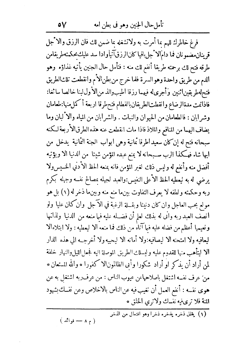فرغ خاطرك للهم بِمَا أمرت بِهِ وَلَا تشغله بِمَا ضمن لَك فَإِن الرزق وَالْأَجَل قرينان مضمونان فَمَا دَامَ الْأَجَل بَاقِيا كَانَ الرزق آتِيَا وَإِذا سد عَلَيْك بِحِكْمَتِهِ طَرِيقا من طرقه فتح لَك برحمته طَرِيقا أَنْفَع لَك مِنْهُ فتأمّل حَال الْجَنِين يَأْتِيهِ غذاؤه وَهُوَ الدَّم من طَرِيق وَاحِدَة وَهُوَ السُّرَّة فَلَمَّا خرج من بطن الْأُم وانقطعت تِلْكَ الطَّرِيق فتح لَهُ طَرِيقين اثْنَيْنِ وأجرى لَهُ فيهمَا رزقا أطيب وألذ من الأول لَبَنًا خَالِصا سائغا فَإِذا تمت مُدَّة الرَّضَاع وانقطعت الطريقان بالفطام فتح طرقاً أَرْبَعَة أكمل مِنْهَا طعامان وشرابان فالطعامان من الْحَيَوَان والنبات والشرابان من الْمِيَاه والألبان وَمَا يُضَاف إِلَيْهِمَا من الْمَنَافِع والملاذ فَإِذا مَاتَ انْقَطَعت عَنهُ هَذِه الطّرق الْأَرْبَعَة لكنه سُبْحَانَهُ فتح لَهُ إِن كَانَ سعيدا طرقا ثَمَانِيَة وَهِي أَبْوَاب الْجنَّة الثَّمَانِية يدْخل من أَيهَا شَاءَ فَهَكَذَا الرب سُبْحَانَهُ لَا يمْنَع عَبده الْمُؤمن شَيْئا من الدُّنْيَا إِلَّا ويؤتيه أفضل مِنْهُ وأنفع لَهُ وَلَيْسَ ذَلِك لغير الْمُؤمن فَإِنَّهُ يمنعهُ الْحَظ الْأَدْنَى الخسيس وَلَا يرضى لَهُ بِهِ ليعطيه الْحَظ الْأَعْلَى النفيس وَالْعَبْد لجهله بمصالح نَفسه وجهله بكرم ربه وحكمته ولطفه لَا يعرف التَّفَاوُت بَين مَا منع مِنْهُ وَبَين مَا ذخر لَهُ بل هُوَ مولع بحب العاجل وَإِن كَانَ دنيئا وبقلة الرَّغْبَة فِي الآجل وَإِن كَانَ عليا وَلَو أنصف العَبْد ربه وأنى لَهُ بذلك لعلم أَن فَضله عَلَيْهِ فِيمَا مَنعه من الدُّنْيَا ولذاتها وَنَعِيمهَا أعظم من فَضله عَلَيْهِ فِيمَا آتَاهُ من ذَلِك فَمَا مَنعه إِلَّا ليعطيه وَلَا ابتلاه إِلَّا ليعافيه وَلَا امتحنه إِلَّا ليصافيه وَلَا أَمَاتَهُ إِلَّا ليحييه وَلَا أخرجه إِلَى هَذِه الدَّار إِلَّا ليتأهب مِنْهَا للقدوم عَلَيْهِ وليسلك الطَّرِيق الموصلة إِلَيْهِ فَجعل اللَّيْلَ وَالنَّهَارَ خِلْفَةً لِمَنْ أَرَادَ أَنْ يَذَّكَّرَ أَوْ أَرَادَ شكُورًا وأبى الظَّالِمُونَ إِلَّا كُفُوراً وَالله الْمُسْتَعَان من عرف نَفسه اشْتغل بإصلاحها عَن عُيُوب النَّاس من عرف ربه اشْتغل بِهِ عَن هوى نَفسه أَنْفَع الْعَمَل أَن تغيب فِيهِ عَن النَّاس بالإخلاص وَعَن نَفسك بِشُهُود المنّة فَلَا ترى فِيهِ نَفسك وَلَا ترى الْخلق