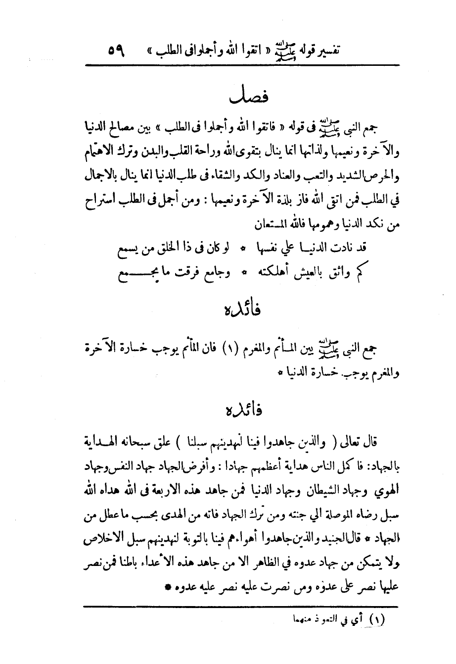الدُّنْيَا وَالْآخِرَة وَنَعِيمهَا ولذاتها إِنَّمَا ينَال بتقوى الله وراحة الْقلب وَالْبدن وَترك الاهتمام والحرص الشَّديد والتعب والعناد والكد والشقاء فِي طلب الدُّنْيَا إِنَّمَا ينَال بالإجمال فِي الطّلب فَمن اتَّقى الله فَازَ بلذة الْآخِرَة وَنَعِيمهَا وَمن أجمل فِي الطّلب استراح من نكد الدُّنْيَا وهمومها فَالله الْمُسْتَعَان