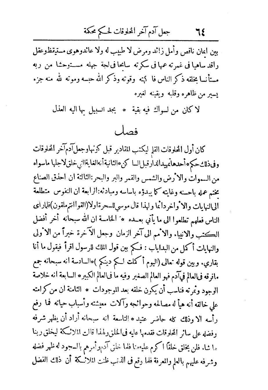 فصل كَانَ أول الْمَخْلُوقَات الْقَلَم ليكتب الْمَقَادِير قبل كَونهَا وَجعل آدم وَآخر