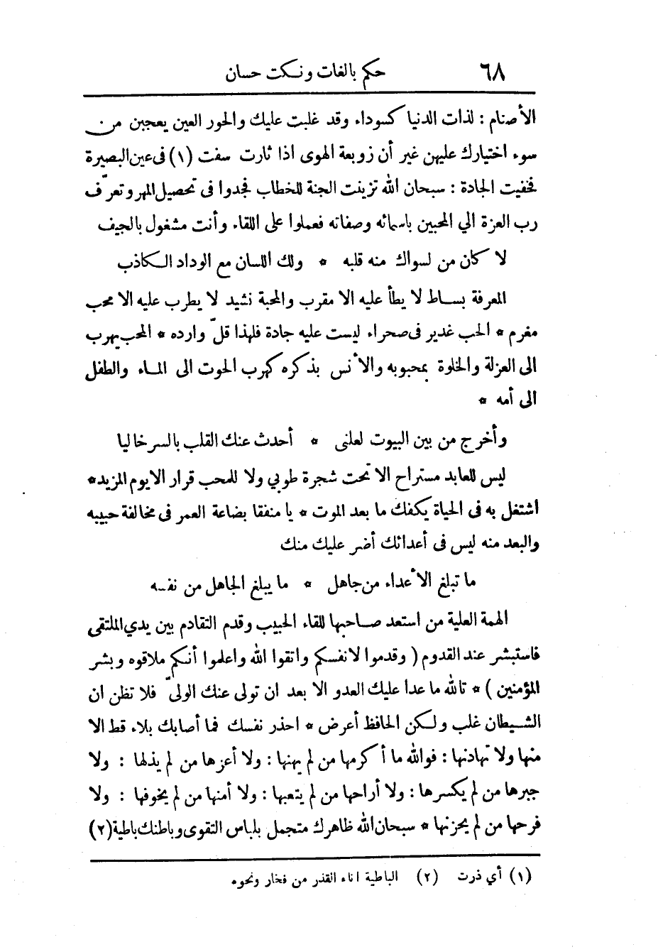 لَيْسَ للعابد مستراح إِلَّا تَحت شَجَرَة طُوبَى وَلَا للمحب قَرَار إِلَّا يَوْم الْمَزِيد اشْتغل بِهِ فِي الْحَيَاة يكفك مَا بعد الْمَوْت يَا منفقا بضَاعَة الْعُمر فِي مُخَالفَة حَبِيبه والبعد مِنْهُ لَيْسَ فِي أعدائك أضرّ عَلَيْك مِنْك