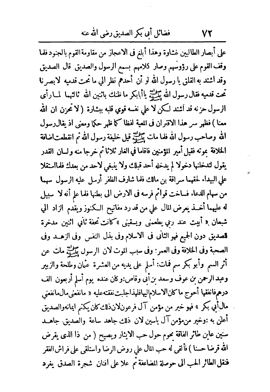 على أبصار الطالبين غشاوة وَهَذَا أبلغ فِي الإعجاز من مقاومة الْقَوْم بالجنود فَلَمَّا وقف الْقَوْم على رؤوسهم وَصَارَ كَلَامهم بسمع الرَّسُول والصدّيق قَالَ الصدّيق وَقد اشْتَدَّ بِهِ القلق يَا رَسُول الله لَو أَن أحدهم نظر إِلَى مَا تَحت قَدَمَيْهِ لَأَبْصَرنَا تَحت قَدَمَيْهِ فَقَالَ رَسُول الله يَا أَبَا بكر مَا ظَنك بِاثْنَيْنِ الله ثالثهما لما رأى الرَّسُول حزنه قد اشْتَدَّ لاكن على نَفسه قوي قلبه بِبِشَارَة {لَا تَحْزَنْ إِنَّ اللَّهَ مَعنا} فَظهر سر هَذَا الاقتران فِي الْمَعِيَّة لفظا كَمَا ظهر حكما وَمعنى اذا يُقَال رَسُول الله وَصَاحب رَسُول الله فَلَمَّا مَاتَ قيل خَليفَة رَسُول الله ثمَّ انْقَطَعت إِضَافَة الْخلَافَة بِمَوْتِهِ فَقيل أَمِير الْمُؤمنِينَ فأقاما فِي الْغَار ثَلَاثًا ثمَّ خرجا مِنْهُ ولسان الْقدر يَقُول لتدخلنها دُخُولا لم يدْخلهُ أحد قبلك وَلَا يَنْبَغِي لأحد من بعْدك فَلَمَّا استقلا على الْبَيْدَاء لحقهما سراقَة بن مَالك فَلَمَّا شَارف الظفر أرسل عَلَيْهِ الرَّسُول سَهْما من سِهَام الدُّعَاء فساخت قَوَائِم فرسه فِي الأَرْض إِلَى بَطنهَا فَلَمَّا علم أَنه لَا سَبِيل لَهُ عَلَيْهِمَا أَخذ يعرض المَال على من قد رد مَفَاتِيح الْكُنُوز وَيقدم الزَّاد إِلَى شبعان أَبيت عِنْد رَبِّي يطعمني ويسقيني كَانَ تحفة ثَانِي اثْنَيْنِ مدخرة للصديق دون الْجَمِيع فَهُوَ الثَّانِي فِي الْإِسْلَام وَفِي بذل النَّفس وَفِي الزّهْد وَفِي الصُّحْبَة وَفِي الْخلَافَة وَفِي الْعُمر وَفِي سَبَب الْمَوْت لِأَن الرَّسُول مَاتَ عَن أثر السم وَأَبُو بكر سم فَمَاتَ أسلم على يَدَيْهِ من الْعشْرَة عُثْمَان وَطَلْحَة وَالزُّبَيْر وَعبد الرَّحْمَن بن عَوْف وَسعد بن أبي وقّاص وَكَانَ عِنْده يَوْم أسلم أَرْبَعُونَ ألف دِرْهَم فأنفقها أحْوج مَا كَانَ الْإِسْلَام إِلَيْهَا فَلهَذَا اجلبت نَفَقَته عَلَيْهِ مَا نَفَعَنِي مَال مَا نَفَعَنِي مَال أبي بكر فَهُوَ خير من مُؤمن آل فِرْعَوْن لِأَن ذَلِك كَانَ يكتم إيمَانه والصدّيق أعلن بِهِ وَخير من مُؤمن آل ياسين لِأَن ذَلِك جَاهد سَاعَة وَالصديق جَاهد سِنِين عاين طَائِر الْفَاقَة يحوم حول حب الإيثار ويصيح من ذَا الَّذِي يُقْرِضُ اللَّهَ قَرْضاً حسنا فَألْقى لَهُ حب المَال على روض الرِّضَا واستلقى على فرَاش الْفقر فَنقل الطَّائِر الْحبّ إِلَى حوصلة المضاعفة ثمَّ علا على أفنان شَجَرَة الصدْق يغرد