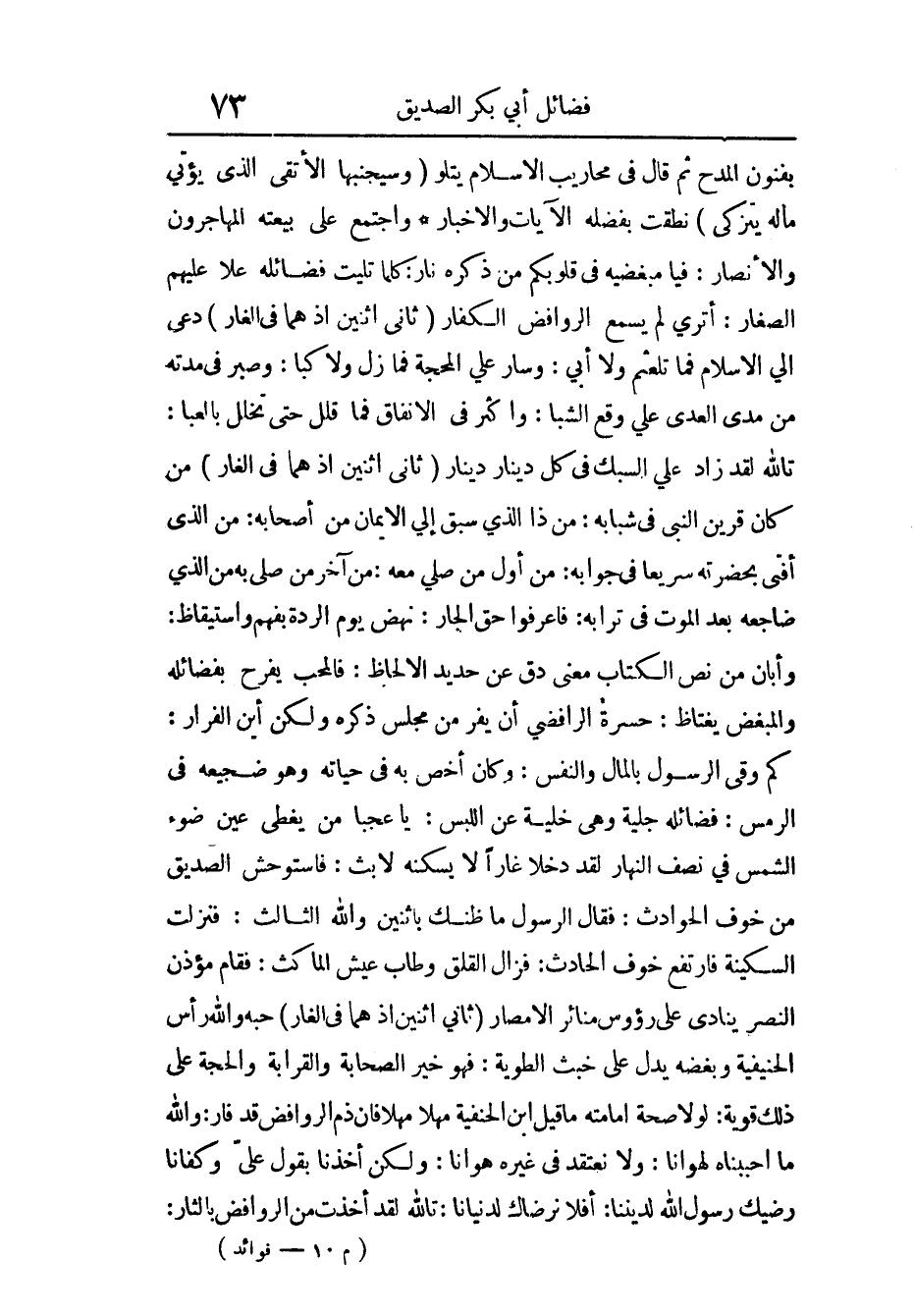 بفنون الْمَدْح ثمَّ قَالَ فِي محاريب الْإِسْلَام يَتْلُو {وَسَيُجَنَّبُهَا الْأَتْقَى الَّذِي يُؤْتِي مَالَهُ يتزكى} نطقت بفضله الْآيَات وَالْأَخْبَار وَاجْتمعَ على بيعَته الْمُهَاجِرُونَ وَالْأَنْصَار فيا مبغضيه فِي قُلُوبكُمْ من ذكره نَار كلما تليت فضائله علا عَلَيْهِم الصغار أَتَرَى لم يسمع الروافض الكفّار {ثَانِيَ اثْنَيْنِ إِذْ هُمَا فِي الْغَار} دعِي إِلَى الْإِسْلَام فَمَا تلعثم وَلَا أَبى وَسَار على المحجة فَمَا زل وَلَا كبا وصبر فِي مدَّته من مدى العدى على وَقع الشبا وَأكْثر فِي الْإِنْفَاق فَمَا قلل حَتَّى تخَلّل بالعبا تالله لقد زَاد على السبك فِي كل دِينَار دِينَار {ثَانِيَ اثْنَيْنِ إِذْ هُمَا فِي الْغَار} من كَانَ قرين النَّبِي فِي شبابه من ذَا الَّذِي سبق إِلَى الْإِيمَان من أَصْحَابه من الَّذِي أفتى بِحَضْرَتِهِ سَرِيعا فِي جَوَابه من أوّل من صلى مَعَه من آخر من صلّى بِهِ من الَّذِي ضاجعه بعد الْمَوْت فِي ترابه فاعرفوا حق الْجَار نَهَضَ يَوْم الرِّدَّة بفهم واستيقاظ وَأَبَان من نَص الْكتاب معنى دق عَن حَدِيد الإلحاظ فالمحب يفرح بفضائله والمبغض يغتاظ حسرة الرافضي أَن يفر من مجْلِس ذكره وَلَكِن أَيْن الْفِرَار كم وقى الرَّسُول بِالْمَالِ وَالنَّفس وَكَانَ أخص بِهِ فِي حَيَاته وَهُوَ ضجيعه فِي الرمس فضائله جليلة وَهِي خليّة عَن اللّبْس ياعجبا من يُغطي عين ضوء الشَّمْس فِي نصف النَّهَار لقد دخلا غارا لَا يسكنهُ لابث فاستوحش الصّديق من خوف الْحَوَادِث فَقَالَ الرَّسُول مَا ظَنك بِاثْنَيْنِ وَالله الثَّالِث فَنزلت السكينَة فارتفع خوف الْحَادِث فَزَالَ القلق وطاب عَيْش الماكث فَقَامَ مُؤذن النَّصْر يُنَادي على رُؤُوس منائر الْأَمْصَار {ثَانِيَ اثْنَيْنِ إِذْ هُمَا فِي الْغَار} حبه وَالله رَأس الحنيفة وبغضه يدل على خبث الطوية فَهُوَ خير الصَّحَابَة والقرابة وَالْحجّة على ذَلِك قَوِيَّة لَوْلَا صِحَة مامته مَا قيل ابْن الحنيفة مهلا فَأن ذمّ الروافض قد فار وَالله مَا أحببناه لهوانا وَلَا نعتقد فِي غَيره هوانا وَلَكِن أَخذنَا بقول عَليّ وكفانا رضيك رَسُول الله لديننا أَفلا نرضاك لدنيانا تالله لقد أخذت من الروافض بالثأر