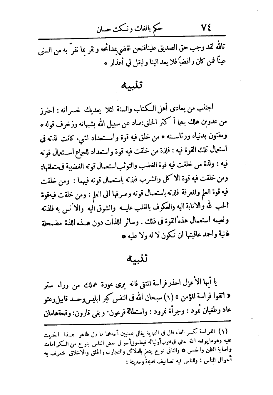 يَا أَيهَا الأعزلاحذر فراسة المتقى فَإِنَّهُ يرى عَورَة عَمَلك من وَرَاء ستر اتَّقوا فراسة الْمُؤمن سُبْحَانَ الله فِي النَّفس كِبر إِبْلِيس وحسد قابيل وعتو عَاد وطغيان ثَمُود وجرأة نمْرُود واستطالة فِرْعَوْن وبغي قَارون وقحّة هامان