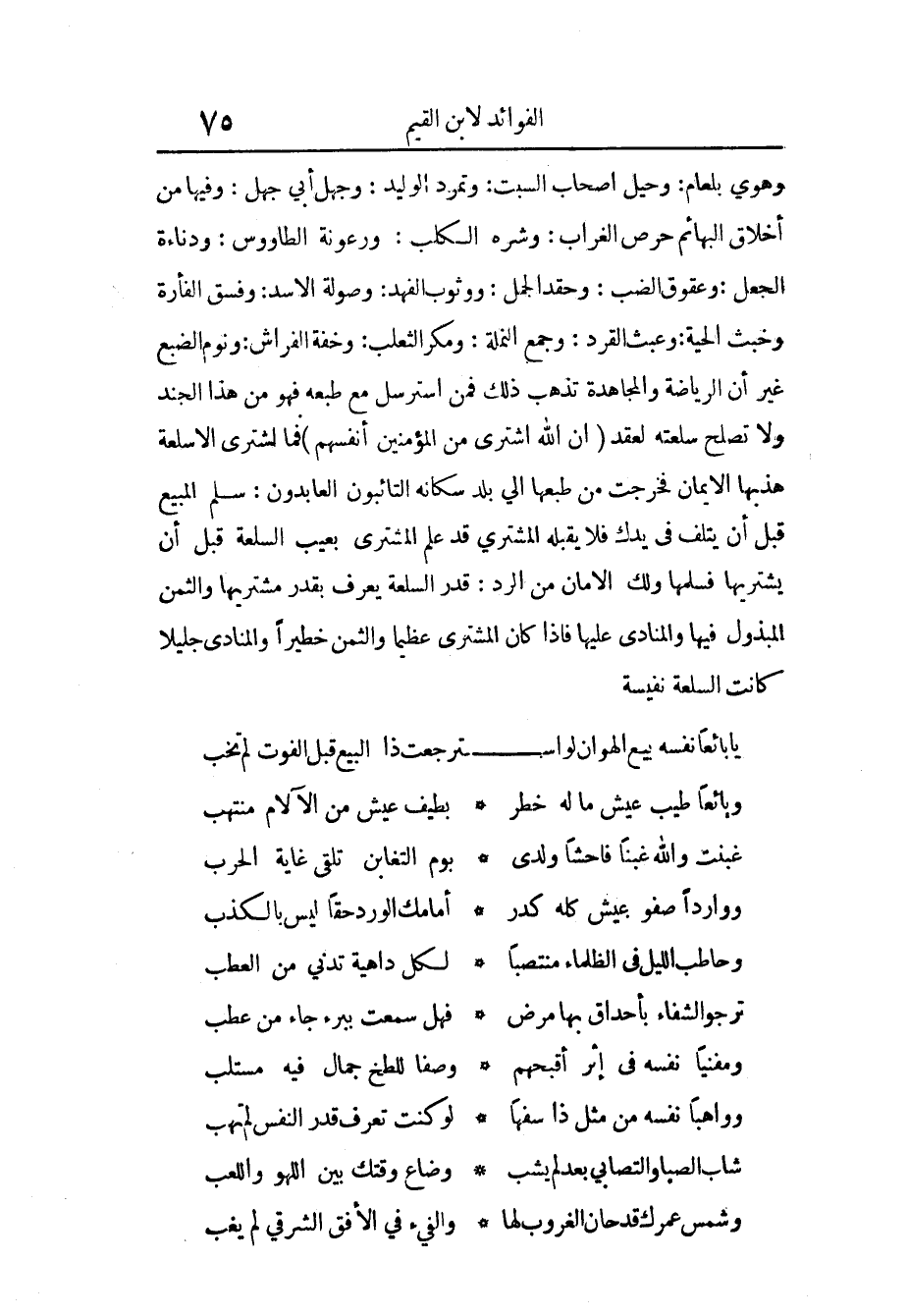 وَهوى بلعام وحيل أَصْحَاب السبت وتمرد لوليد وَجَهل أبي جهل وفيهَا من أَخْلَاق الْبَهَائِم حرص الْغُرَاب وشره الْكَلْب ورعونة الطاووس ودناءة الْجعل وعقوق الضَّب وحقد الْجمل ووثوب الفهد وصولة الْأسد وَفسق الْفَأْرَة وخبث الْحَيَّة وعبث القرد وَجمع النملة ومكر الثَّعْلَب وخفة الْفراش ونوم الضبع غير أَن الرياضة والمجاهدة تذْهب ذَلِك فَمن استرسل مَعَ طبعه فَهُوَ من هَذَا الْجند وَلَا تصلح سلْعَته لعقد {إِنَّ اللَّهَ اشْتَرَى مِنَ الْمُؤْمِنِينَ أَنْفُسَهُمْ} فَمَا اشْترى إِلَّا سلْعَة هذبها الْإِيمَان فَخرجت من طبعها إِلَى بلد سكانه التائبون العابدون سلم الْمَبِيع قبل أَن يتْلف فِي يدك فَلَا يقبله المُشْتَرِي قد علم المُشْتَرِي بِعَيْب السّلْعَة قبل أَن يَشْتَرِيهَا فسلمها وَلَك الْأمان من الرَّد قدر السّلْعَة يعرف بِقدر مشتريها وَالثمن المبذول فِيهِ والمنادي عَلَيْهَا فَإِذا كَانَ الْمُشْتَرى عَظِيما وَالثمن خطيرا والمنادي جَلِيلًا كَانَت السّلْعَة نفيسة