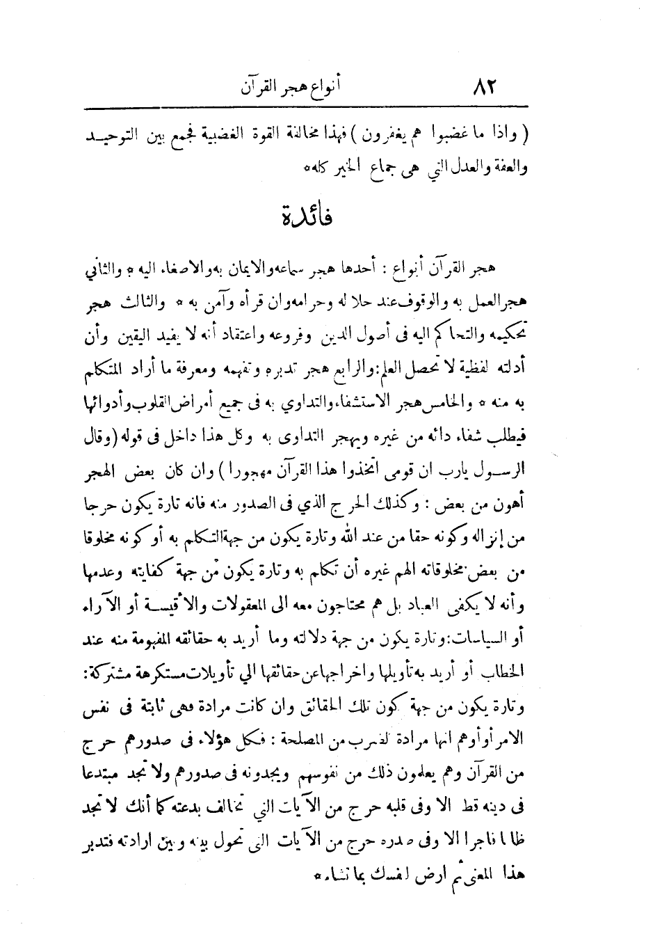 فَائِدَة هجر الْقُرْآن أَنْوَاع أَحدهَا هجر سَمَاعه وَالْإِيمَان بِهِ والإصغاء إِلَيْهِ
