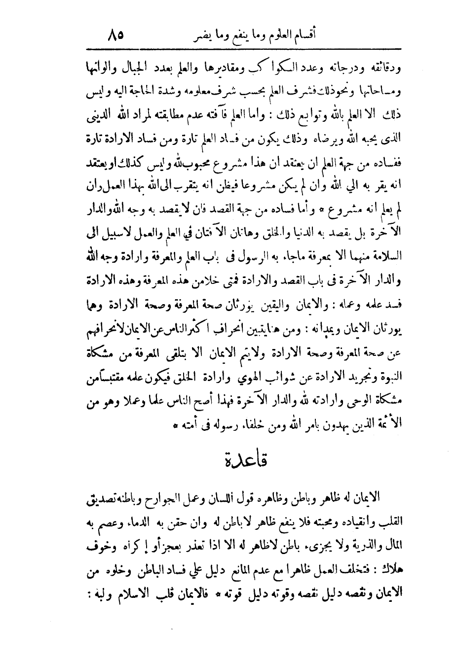 ودقائقه ودرجاته وَعدد الْكَوَاكِب ومقاديرها وَالْعلم بِعَدَد الْجبَال وألوانها ومساحتها وَنَحْو ذَلِك فشرف الْعلم بِحَسب شرف معلومه وَشدَّة الْحَاجة إِلَيْهِ وَلَيْسَ ذَلِك إِلَّا الْعلم بِاللَّه وتوابع ذَلِك وَأما الْعلم فآفته عدم مطابقته لمراد الله الديني الَّذِي يُحِبهُ الله ويرضاه وَذَلِكَ يكون من فَسَاد الْعلم تَارَة وَمن فَسَاد الْإِرَادَة تَارَة ففساد من جِهَة الْعلم أَن يعْتَقد أَن هَذَا مَشْرُوع مَحْبُوب لله وَلَيْسَ كَذَلِك أَو يعْتَقد أَنه يقر بِهِ إِلَى الله وَإِن لم يكن مَشْرُوعا فيظن أَنه يتَقرَّب إِلَى الله بِهَذَا الْعَمَل وَإِن لم يعلم أَنه مَشْرُوع وَأما فَسَاده من جِهَة الْقَصْد فان لَا يقْصد بِهِ وَجه الله وَالدَّار الْآخِرَة بل يقْصد بِهِ الدُّنْيَا والخلق وَهَاتَانِ الآفتان فِي الْعلم وَالْعَمَل لَا سَبِيل إِلَى السَّلامَة مِنْهُمَا إِلَّا بِمَعْرِِفَة مَا جَاءَ بِهِ الرَّسُول فِي بَاب الْعلم والمعرفة وَإِرَادَة وَجه الله وَالدَّار الْآخِرَة فِي بَاب الْقَصْد والرادة فَمَتَى خلا من هَذِه الْمُعَرّف وَهَذِه الْإِرَادَة فسد علمه وَعَمله وَالْإِيمَان وَالْيَقِين يورثان صِحَة الْمعرفَة وَصِحَّة الْإِرَادَة يورثان الْإِيمَان ويمدانه وَمن هُنَا يتَبَيَّن انحراف أَكثر النَّاس عَن الْأَيْمَان ولانحرافهم عَن صِحَة الْمعرفَة وَصِحَّة الْإِرَادَة وَلَا يتم الْإِيمَان إِلَّا بتلقي الْمعرفَة من مشكاة النُّبُوَّة وَتَجْرِيد الْإِرَادَة عَن شوائب الْهوى وَإِرَادَة الْخلق فَيكون علمه مقتبسا من مشكاة الْوَحْي وإرادته لله وَالدَّار الْآخِرَة فَهَذَا أصح النَّاس علما وَعَملا وَهُوَ من الْأَئِمَّة الَّذين يهْدُونَ بِأَمْر الله وَمن خلفاء رَسُوله فِي أمته