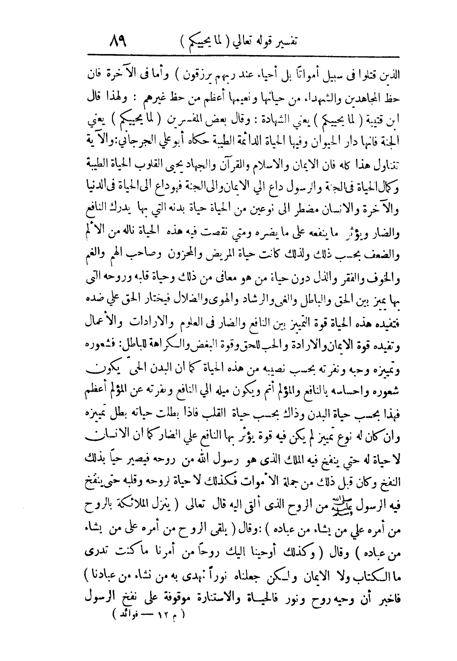 {الَّذِينَ قُتِلُوا فِي سَبِيلِ اللَّهِ أَمْوَاتاً بَلْ أَحْيَاءٌ عِنْدَ رَبهم يرْزقُونَ} وَإِمَّا فِي الْآخِرَة فَإِن حَظّ الْمُجَاهدين وَالشُّهَدَاء من حَيَاتهَا وَنَعِيمهَا أعظم من حَظّ غَيرهم وَلِهَذَا قَالَ ابْن قُتَيْبَة لما يحيكم يَعْنِي الشَّهَادَة وَقَالَ بعض الْمُفَسّرين لما يحيكم يَعْنِي الْجنَّة فَإِنَّهَا دَار الْحَيَوَان وفيهَا الْحَيَاة الدائمة الطّيبَة حَكَاهُ أَبُو عَليّ الْجِرْجَانِيّ وَالْآيَة تتَنَاوَل هَذَا كُله فَإِن الْإِيمَان وَالْإِسْلَام وَالْقُرْآن وَالْجهَاد يحي الْقُلُوب الْحَيَاة الطّيبَة وَكَمَال الْحَيَاة فِي الْجنَّة وَالرَّسُول دَاع إِلَى الْإِيمَان وَإِلَى الْجنَّة فَهُوَ دَاع إِلَى الْحَيَاة فِي الدُّنْيَا وَالْآخِرَة وَالْإِنْسَان مُضْطَر إِلَى نَوْعَيْنِ من الْحَيَاة حَيَاة بدنه الَّتِي بهَا يدْرك النافع والضار ويؤثر مَا يَنْفَعهُ على مَا يضرّه وَمَتى نقصت فِيهِ هَذِه الْحَيَاة ناله من الْأَلَم والضعف بِحَسب ذَلِك وَلذَلِك كَانَت حَيَاة الْمَرِيض والمحزون وَصَاحب الْهم وَالْغَم وَالْخَوْف والفقر والذل دون حَيَاة من هُوَ معافى من ذَلِك وحياة قلبه وروحه الَّتِي بهَا يُمَيّز بَين الْحق وَالْبَاطِل والغي والرشاد والهوى والضلال فيختار الْحق على ضِدّه فتفيده هَذِه الْحَيَاة قُوَّة التميز بَين النافع والضار فِي الْعُلُوم والإرادات والأعمال وتفيده قُوَّة الْإِيمَان والإرادة وَالْحب للحق وَقُوَّة البغض وَالْكَرَاهَة للباطل فشعوره وتمييزه وحبه ونفرته بِحَسب نصِيبه من هَذِه الْحَيَاة كَمَا أَن الْبدن الْحَيّ يكون شعوره وإحساسه بالنافع والمؤلم أتم وَيكون ميله إِلَى النافع ونفرته عَن المؤلم أعظم فَهَذَا بِحَسب حَيَاة الْبدن وَذَاكَ بِحِسَاب حَيَاة الْقلب فَإِذا بطلت حَيَاته بَطل تَمْيِيزه وَإِن كَانَ لَهُ نوع تَمْيِيز لم يكن فِيهِ قُوَّة يُؤثر بهَا النافع على الضار كَمَا أَن الْإِنْسَان لَا حَيَاة لَهُ حَتَّى ينْفخ فِيهِ الْملك الَّذِي هُوَ رَسُول الله من روحه فَيصير حَيا بذلك النفخ وان كَانَ قبل ذَلِك من جملَة الْأَمْوَات فَكَذَلِك لَا حَيَاة لروحه وَقَلبه حَتَّى ينْفخ فِيهِ الرَّسُول من الرّوح الَّذِي ألْقى إِلَيْهِ قَالَ تَعَالَى