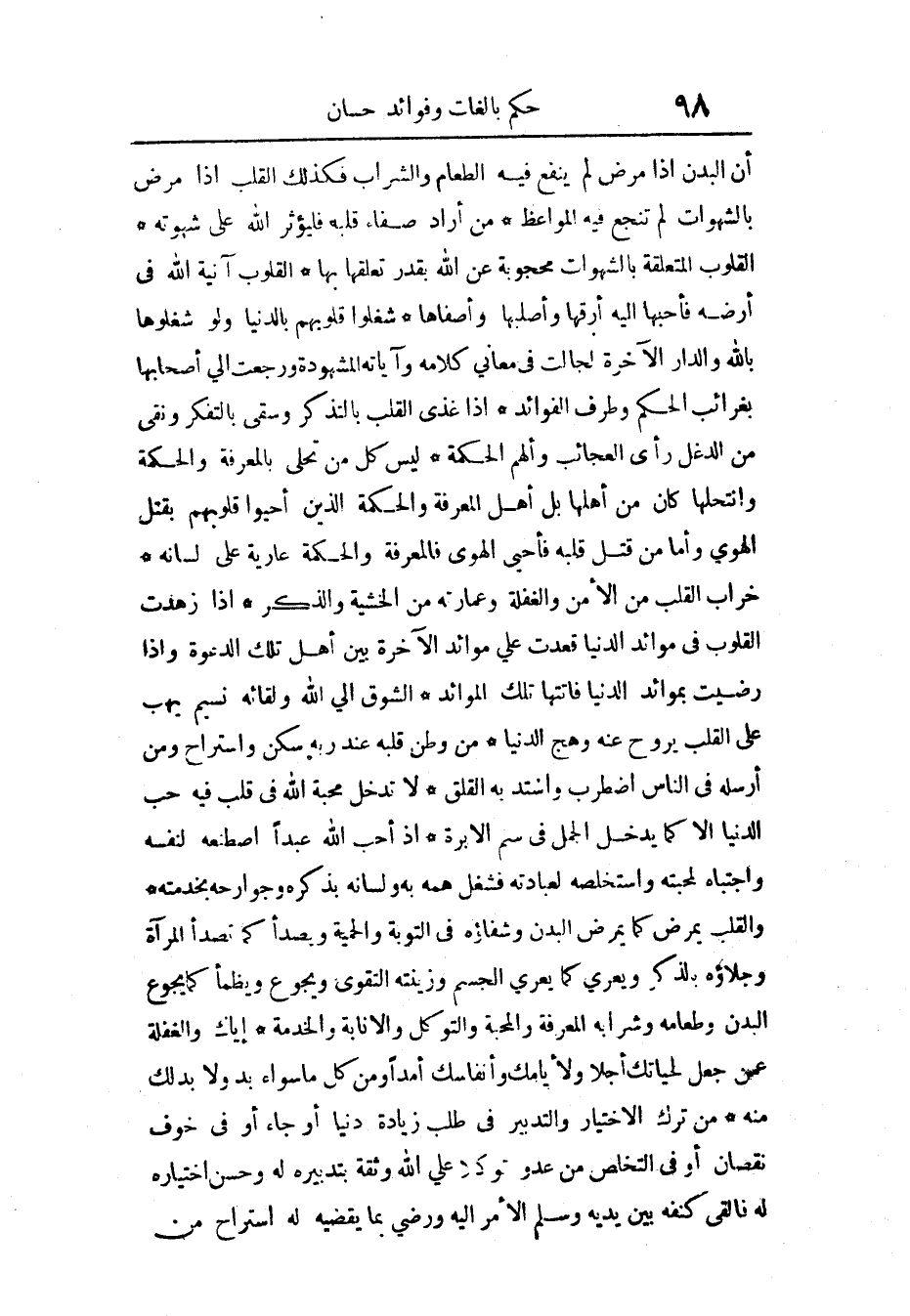 أَن الْبدن إِذا مرض لم ينفع فِيهِ الطَّعَام وَالشرَاب فَكَذَلِك الْقلب إِذا مرض بالشهوات لم تنجع فِيهِ المواعظ وَمن أَرَادَ صفاء قلبه فليؤثر الله على شَهْوَته الْقُلُوب الْمُتَعَلّقَة بالشهوات محجوبة عَن الله بِقدر تعلقهَا بهَا الْقُلُوب آنِية الله فِي أرضه فأحبها إِلَيْهِ أرقها وأصلبها وأصفاها شغلوا قُلُوبهم بالدنيا وَلَو شغلوها بِاللَّه وَالدَّار الْآخِرَة لجالت فِي مَعَاني كَلَامه وآياته المشهودة وَرجعت إِلَى أَصْحَابهَا بِغَرَائِب الحكم وطرف الْفَوَائِد إِذا غذي الْقلب بالتذكر وَسقي بالتفكّر ونقي من الدغل رأى الْعَجَائِب وألهم الْحِكْمَة لَيْسَ كل من تحلى بالمعرفة وَالْحكمَة وانتحلها كَانَ من أَهلهَا بل أهل الْمعرفَة وَالْحكمَة الَّذين أحيوا قُلُوبهم بقتل الْهوى وَأما من قتل قلبه فأحيى الْهوى الْمعرفَة وَالْحكمَة عَارِية على لِسَانه خراب الْقلب من الْأَمْن والغفلة وعمارته من الخشية وَالذكر إِذا زهدت الْقُلُوب فِي مَوَائِد الدُّنْيَا قعدت على مَوَائِد الْآخِرَة بَين أهل تِلْكَ الدعْوَة وَإِذا رضيت بموائد الدُّنْيَا فاتتها تِلْكَ الموائد الشوق إِلَى الله ولقائه نسيم يهب على الْقلب يروح عَنهُ وهج الدُّنْيَا من وطّن قلبه عِنْد ربه سكن واستراح وَمن أرْسلهُ فِي النَّاس اضْطربَ وَاشْتَدَّ بِهِ القلق لَا تدخل محبَّة الله فِي قلب فِيهِ حب الدُّنْيَا إِلَّا كَمَا يدْخل الْجمل فِي سم الابرة اذ أحب الله عبدا اصطنعه لنَفسِهِ واجتباه لمحبته واستخلصه لعبادته فشغل همه بِهِ وَلسَانه بِذكرِهِ وجوارحه بخدمته وَالْقلب يمرض كَمَا يمرض الْبدن وشفاؤه فِي التَّوْبَة وَالْحمية ويصدأ كَمَا تصدأ الْمرْآة وجلاؤه بِالذكر ويعرى كَمَا يعرى الْجِسْم وزينته التَّقْوَى ويجوع ويظمأ كَمَا يجوع الْبدن وَطَعَامه وَشَرَابه الْمعرفَة والمحبة والتوكل والإنابة والخدمة إياك والغفلة عَمَّن جعل لحياتك أَََجَلًا ولأيامك وأنفاسك أمدا وَمن كل مَا سواهُ بُد وَلَا بذلك مِنْهُ من ترك الِاخْتِيَار وَالتَّدْبِير فِي طلب زِيَادَة دنيا أَو جاه أَو فِي خوف نُقْصَان أَو فِي التَّخَلُّص من عَدو توكلا على الله وثقة بتدبيره لَهُ وَحسن اخْتِيَاره لَهُ فَألْقى كنفه بَين يَدَيْهِ وَسلم الْأَمر إِلَيْهِ وَرَضي بِمَا يَقْضِيه لَهُ استراح من