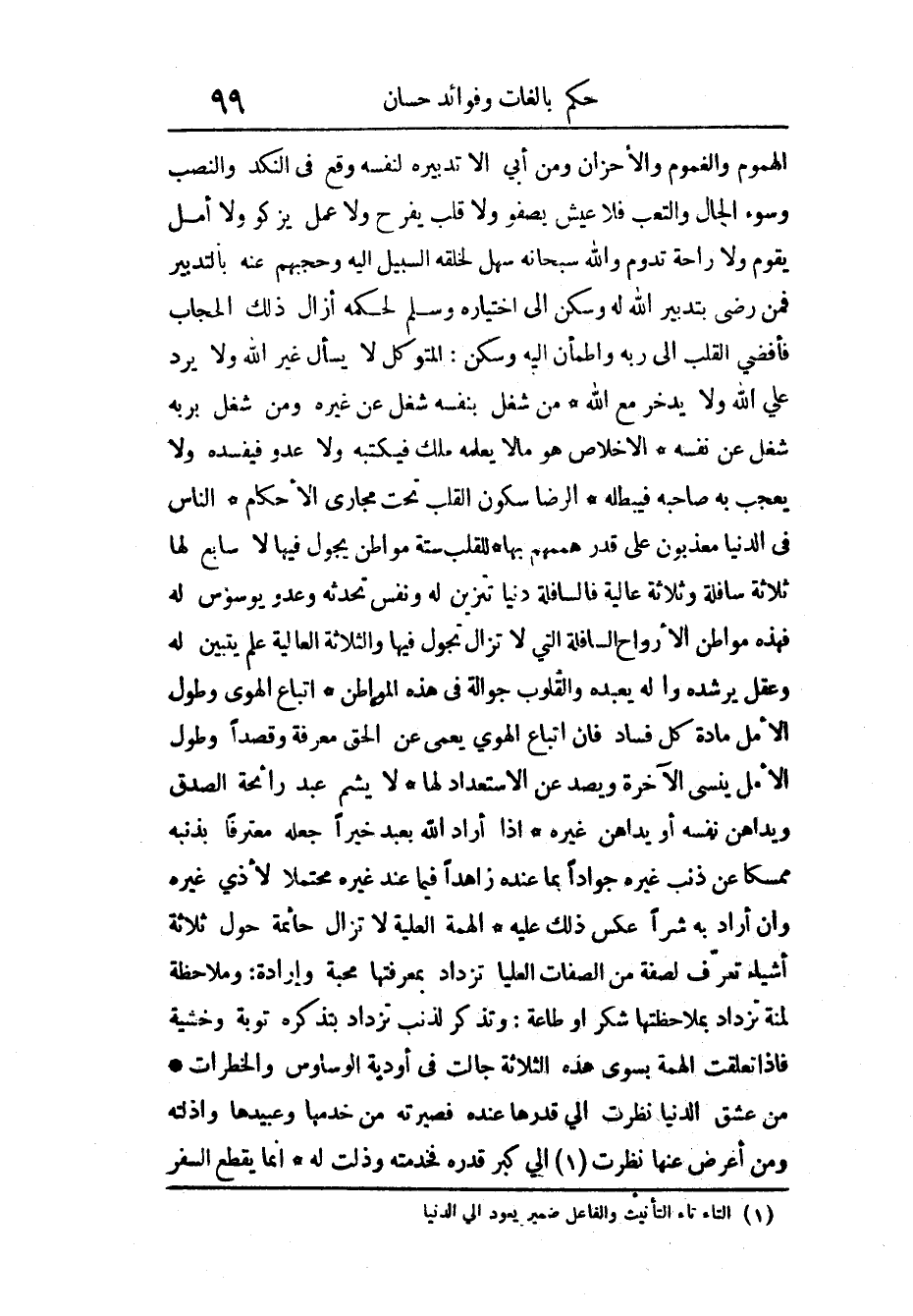 الهموم والغموم وَالْأَحْزَان وَمن أَبى إِلَّا تَدْبيره لنَفسِهِ وَقع فِي النكد وَالنّصب وَسُوء الْحَال والتعب فَلَا عَيْش يصفو وَلَا قلب يفرح وَلَا عمل يزكو وَلَا أمل يقوم وَلَا رَاحَة تدوم وَالله سُبْحَانَهُ سهّل لخلقه السَّبِيل إِلَيْهِ وحجبهم عَنهُ بِالتَّدْبِيرِ فَمن رَضِي بتدبير الله لَهُ وَسكن إِلَى اخْتِيَاره وسلّم لحكمه أَزَال ذَلِك الْحجاب فأفضى الْقلب إِلَى ربه وَاطْمَأَنَّ إِلَيْهِ وَسكن المتَوَكل لَا يسْأَل غير الله وَلَا يرد على الله وَلَا يدّخر مَعَ الله من شبغل بِنَفسِهِ شغل عَن غَيره وَمن شغل بربه شغل عَن نَفسه الْإِخْلَاص هُوَ مَا لَا يُعلمهُ ملك فيكتبه وَلَا عَدو فيفسده وَلَا يعجب بِهِ صَاحبه فيبطله الرِّضَا سُكُون الْقلب تَحت مجاري الْأَحْكَام النَّاس فِي الدُّنْيَا معذّبون على قدر هممهم بهَا للقلب سِتَّة مَوَاطِن يجول فِيهَا لَا سَابِع لَهَا ثَلَاثَة سافلة وَثَلَاثَة عالية فالسافلة دنيا تزين لَهُ وَنَفس تحدثه وعدو يوسوس لَهُ فَهَذِهِ مَوَاطِن الْأَرْوَاح السافلة الَّتِي لَا تزَال تجول فِيهَا وَالثَّلَاثَة الْعَالِيَة علم يتَبَيَّن لَهُ وعقل يرشده وإله يعبده والقلوب جوّالة فِي هَذِه المواطن إتباع لهوى وَطول الأمل مَادَّة كل فَسَاد فَإِن اتِّبَاع الْهوى يعمي عَن الْحق معرفَة وقصدا وَطول الأمل ينسي الْآخِرَة ويصد عَن الاستعداد لَهَا لَا يشم عبد رَائِحَة الصدْق ويداهن نَفسه أَو يداهن غَيره إِذا أَرَادَ الله بِعَبْد خيرا جعله معترفا بِذَنبِهِ ممسكا عَن ذَنْب غَيره جوادا بِمَا عِنْده زاهدا فِيمَا عِنْده مُحْتملا لأَذى غَيره وَإِن أَرَادَ بِهِ شرا عكس ذَلِك عَلَيْهِ الهمّة العليّة لَا تزَال حائمة حول ثَلَاثَة أَشْيَاء تعرف لصفة من الصِّفَات الْعليا تزداد بمعرفتها محبَّة وَإِرَادَة وملاحظة لمنة تزداد بملاحظتها شكر اَوْ اطاعة وتذكر لذنب تزداد بتذكره تَوْبَة وخشية فَإِذا تعلّقت الهمّة بسوى هَذِه الثَّلَاثَة جالت فِي أَوديَة الوساوس والخطرات من عشق الدُّنْيَا نظرت إِلَى قدرهَا عِنْده فصيرته من خدمها وعبيدها وأذلّته وَمن أعرض عَنْهَا نظرت إِلَى كبر قدره فخدمته وذلّت لَهُ إِنَّمَا يقطع السّفر