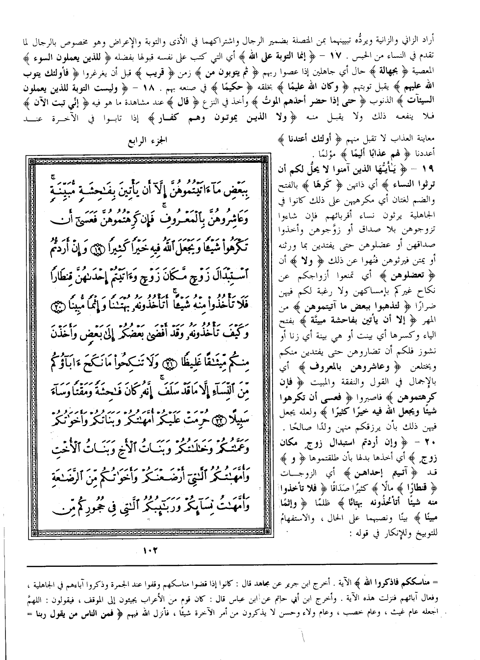 {يأيها الَّذِينَ آمَنُوا لَا يَحِلّ لَكُمْ أَنْ تَرِثُوا النِّسَاء} أَيْ ذَاتهنَّ {كَرْهًا} بِالْفَتْحِ وَالضَّمّ لُغَتَانِ أَيْ مُكْرِهِيهِنَّ عَلَى ذَلِكَ كَانُوا فِي الْجَاهِلِيَّة يَرِثُونَ نِسَاء أَقْرِبَائِهِمْ فَإِنْ شَاءُوا تَزَوَّجُوهُنَّ بِلَا صَدَاق أَوْ زَوَّجُوهُنَّ وَأَخَذُوا صَدَاقهنَّ أَوْ عَضَلُوهُنَّ حَتَّى يَفْتَدِينَ بِمَا وَرِثْنَهُ أَوْ يَمُتْنَ فَيَرِثُوهُنَّ فَنُهُوا عَنْ ذَلِكَ {وَلَا} أَنْ {تَعْضُلُوهُنَّ} أَيْ تَمْنَعُوا أَزْوَاجكُمْ عَنْ نِكَاح غَيْركُمْ بِإِمْسَاكِهِنَّ وَلَا رَغْبَة لَكُمْ فِيهِنَّ ضِرَارًا {لِتَذْهَبُوا بِبَعْضِ مَا آتَيْتُمُوهُنَّ} مِنْ الْمَهْر {إلَّا أَنْ يَأْتِينَ بِفَاحِشَةٍ مُبَيِّنَة} بِفَتْحِ الْيَاء وَكَسْرهَا أَيْ بَيَّنَتْ أَوْ هِيَ بَيِّنَة أَيْ زِنًا أَوْ نُشُوز فَلَكُمْ أَنْ تُضَارُّوهُنَّ حَتَّى يَفْتَدِينَ مِنْكُمْ وَيَخْتَلِعْن {وَعَاشِرُوهُنَّ بِالْمَعْرُوفِ} أَيْ بِالْإِجْمَالِ فِي الْقَوْل وَالنَّفَقَة وَالْمَبِيت {فَإِنْ كَرِهْتُمُوهُنَّ} فَاصْبِرُوا {فَعَسَى أَنْ تَكْرَهُوا شَيْئًا وَيَجْعَل اللَّه فِيهِ خَيْرًا كَثِيرًا} وَلَعَلَّهُ يَجْعَل فِيهِنَّ ذَلِكَ بِأَنْ يَرْزُقكُمْ مِنْهُنَّ وَلَدًا صَالِحًا