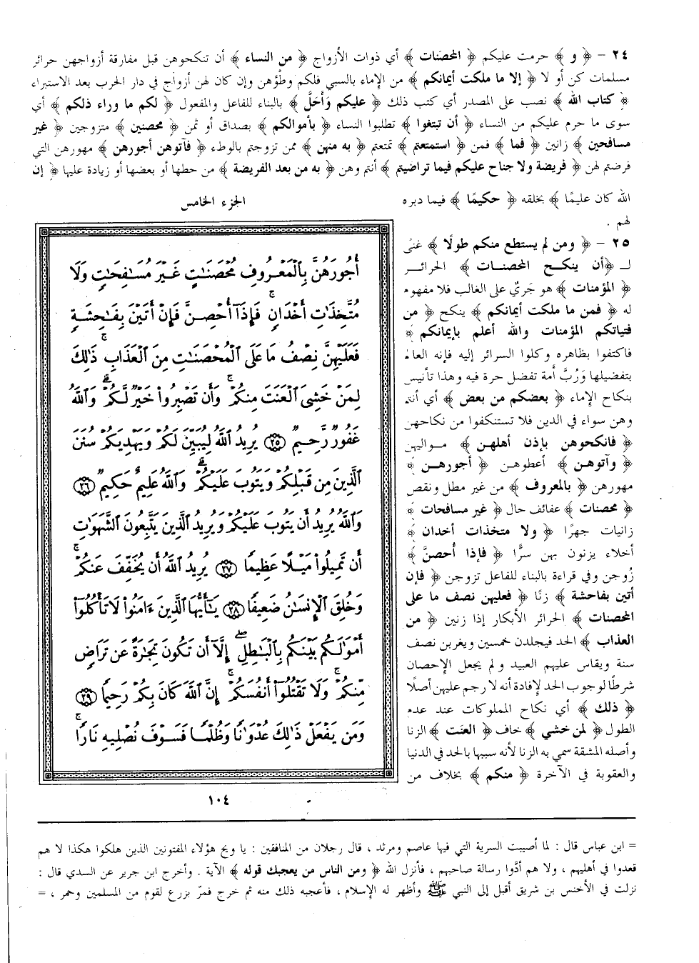 {وَ} حُرِّمَتْ عَلَيْكُمْ {الْمُحْصَنَات} أَيْ ذَوَات الْأَزْوَاج {مِنْ النِّسَاء} أَنْ تَنْكِحُوهُنَّ قَبْل مُفَارَقَة أَزْوَاجهنَّ حَرَائِر مُسْلِمَات كُنَّ أَوْ لَا {إلَّا مَا مَلَكَتْ أَيْمَانكُمْ} مِنْ الْإِمَاء بِالسَّبْيِ فَلَكُمْ وَطْؤُهُنَّ وَإِنْ كَانَ لَهُنَّ أَزْوَاج فِي دَار الْحَرْب بَعْد الِاسْتِبْرَاء {كِتَاب اللَّه} نُصِبَ عَلَى الْمَصْدَر أَيْ كَتَبَ ذَلِكَ {عَلَيْكُمْ وَأُحِلَّ} بِالْبِنَاءِ لِلْفَاعِلِ وَالْمَفْعُول {لَكُمْ مَا وَرَاء ذَلِكُمْ} أَيْ سِوَى مَا حُرِّمَ عَلَيْكُمْ مِنْ النِّسَاء {أَنْ تَبْتَغُوا} تَطْلُبُوا النِّسَاء {بِأَمْوَالِكُمْ} بِصَدَاقٍ أَوْ ثَمَن {مُحْصِنِينَ} مُتَزَوِّجِينَ {غَيْر مُسَافِحِينَ} زَانِينَ {فَمَا} فَمَنْ {اسْتَمْتَعْتُمْ} تَمَتَّعْتُمْ {بِهِ مِنْهُنَّ} مِمَّنْ تَزَوَّجْتُمْ بِالْوَطْءِ {فَآتُوهُنَّ أُجُورهنَّ} مُهُورهنَّ الَّتِي فَرَضْتُمْ لَهُنَّ {فَرِيضَة وَلَا جُنَاح عَلَيْكُمْ فِيمَا تَرَاضَيْتُمْ} أَنْتُمْ وَهُنَّ {بِهِ مِنْ بَعْد الْفَرِيضَة} مِنْ حَطّهَا أَوْ بَعْضهَا أَوْ زِيَادَة عَلَيْهَا إنَّ اللَّه كَانَ عَلِيمًا} بِخَلْقِهِ {حَكِيمًا} فِيمَا دَبَّرَهُ لَهُمْ