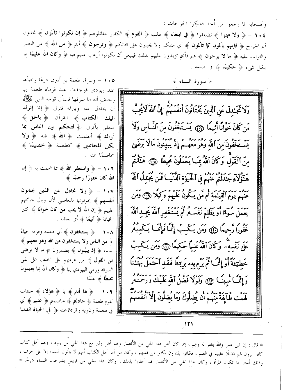 وَسَرَقَ طُعْمَة بْن أُبَيْرِق دِرْعًا وَخَبَّأَهَا عِنْد يَهُودِيّ فَوُجِدَتْ عِنْده فَرَمَاهُ طُعْمَة بِهَا وَحَلَفَ أَنَّهُ مَا سَرَقَهَا فَسَأَلَ قَوْمه النَّبِيّ صَلَّى اللَّه عَلَيْهِ وَسَلَّمَ أَنْ يُجَادِل عَنْهُ وَيُبْرِّئهُ فَنَزَلَ {إنَّا أَنْزَلْنَا إلَيْك الْكِتَاب} الْقُرْآن {بِالْحَقِّ} مُتَعَلِّق بِأَنْزَل {لِتَحْكُم بَيْن النَّاس بِمَا أَرَاك} أعلمك {الله} فِيهِ {وَلَا تَكُنْ لِلْخَائِنِينَ} كَطُعْمَةَ {خَصِيمًا} مُخَاصِمًا عنه