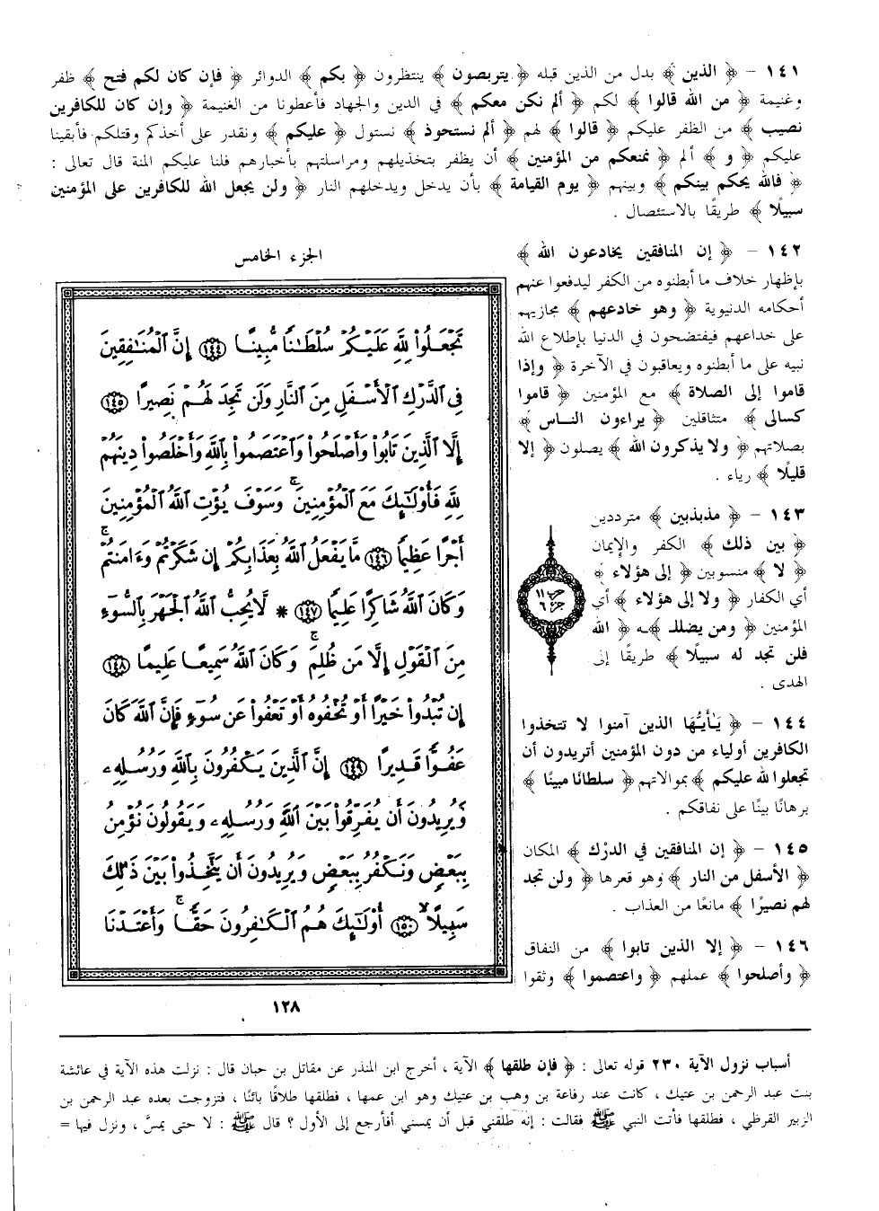 {الَّذِينَ} بَدَل مِنْ الَّذِينَ قَبْله {يَتَرَبَّصُونَ} يَنْتَظِرُونَ {بِكُمْ} الدَّوَائِر {فَإِنْ كَانَ لَكُمْ فَتْح} ظَفَر وَغَنِيمَة {مِنْ اللَّه قَالُوا} لَكُمْ {أَلَمْ نَكُنْ مَعَكُمْ} فِي الدِّين وَالْجِهَاد فَأَعْطُونَا مِنْ الْغَنِيمَة {وَإِنْ كَانَ لِلْكَافِرِينَ نَصِيب} مِنْ الظَّفَر عَلَيْكُمْ {قَالُوا} لَهُمْ {أَلَمْ نَسْتَحْوِذ} نَسْتَوْلِ {عَلَيْكُمْ} وَنَقْدِر عَلَى أَخْذكُمْ وَقَتْلكُمْ فَأَبْقَيْنَا عَلَيْكُمْ {وَ} أَلَمْ {نَمْنَعكُمْ مِنْ الْمُؤْمِنِينَ} أَنْ يَظْفَر بِتَخْذِيلِهِمْ وَمُرَاسَلَتهمْ بأخبارهم فلنا عليكم المنة قال تعالى {فَاَلله يَحْكُم بَيْنكُمْ} وَبَيْنهمْ {يَوْم الْقِيَامَة} بِأَنْ يُدْخِل وَيُدْخِلهُمْ النَّار {وَلَنْ يَجْعَل اللَّه لِلْكَافِرِينَ عَلَى الْمُؤْمِنِينَ سَبِيلًا} طَرِيقًا بِالِاسْتِئْصَالِ
