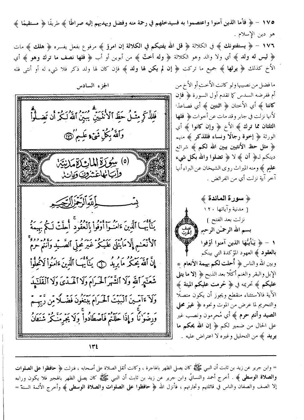 {يَسْتَفْتُونَك} فِي الْكَلَالَة {قُلْ اللَّه يُفْتِيكُمْ فِي الْكَلَالَة إنْ امْرُؤٌ} مَرْفُوع بِفِعْلٍ يُفَسِّرهُ {هَلَكَ} مَاتَ {لَيْسَ لَهُ وَلَد} أَيْ وَلَا وَالِد وَهُوَ الْكَلَالَة {وَلَهُ أُخْت} مِنْ أَبَوَيْنِ أَوْ أَب {فَلَهَا نِصْف مَا تَرَكَ وَهُوَ} أَيْ الْأَخ كَذَلِكَ {يَرِثهَا} جَمِيع مَا تَرَكَتْ {إنْ لَمْ يَكُنْ لَهَا وَلَد} فَإِنْ كَانَ لَهَا وَلَد ذَكَر فَلَا شَيْء لَهُ أَوْ أُنْثَى فَلَهُ مَا فَضَلَ مِنْ نَصِيبهَا وَلَوْ كَانَتْ الْأُخْت أَوْ الْأَخ مِنْ أُمّ فَفَرْضه السُّدُس كَمَا تَقَدَّمَ أَوَّل السُّورَة {فَإِنْ كَانَتَا} أَيْ الْأُخْتَانِ {اثْنَتَيْنِ} أَيْ فَصَاعِدًا لِأَنَّهَا نَزَلَتْ فِي جابر وقد مات عن أخوات {فلها الثُّلُثَانِ مِمَّا تَرَكَ} الْأَخ {وَإِنْ كَانُوا} أَيْ الْوَرَثَة {إخْوَة رِجَالًا وَنِسَاء فَلِلذَّكَرِ} مِنْهُمْ {مِثْل حَظّ الْأُنْثَيَيْنِ يُبَيِّن اللَّه لَكُمْ} شَرَائِع دِينكُمْ ل {أَنْ} لَا {تَضِلُّوا وَاَللَّه بِكُلِّ شَيْء عَلِيم} وَمِنْهُ الْمِيرَاث رَوَى الشَّيْخَانِ عَنْ الْبَرَاء أَنَّهَا آخِر آيَة نَزَلَتْ أَيْ مِنْ الْفَرَائِض = 5 سُورَة المائدة