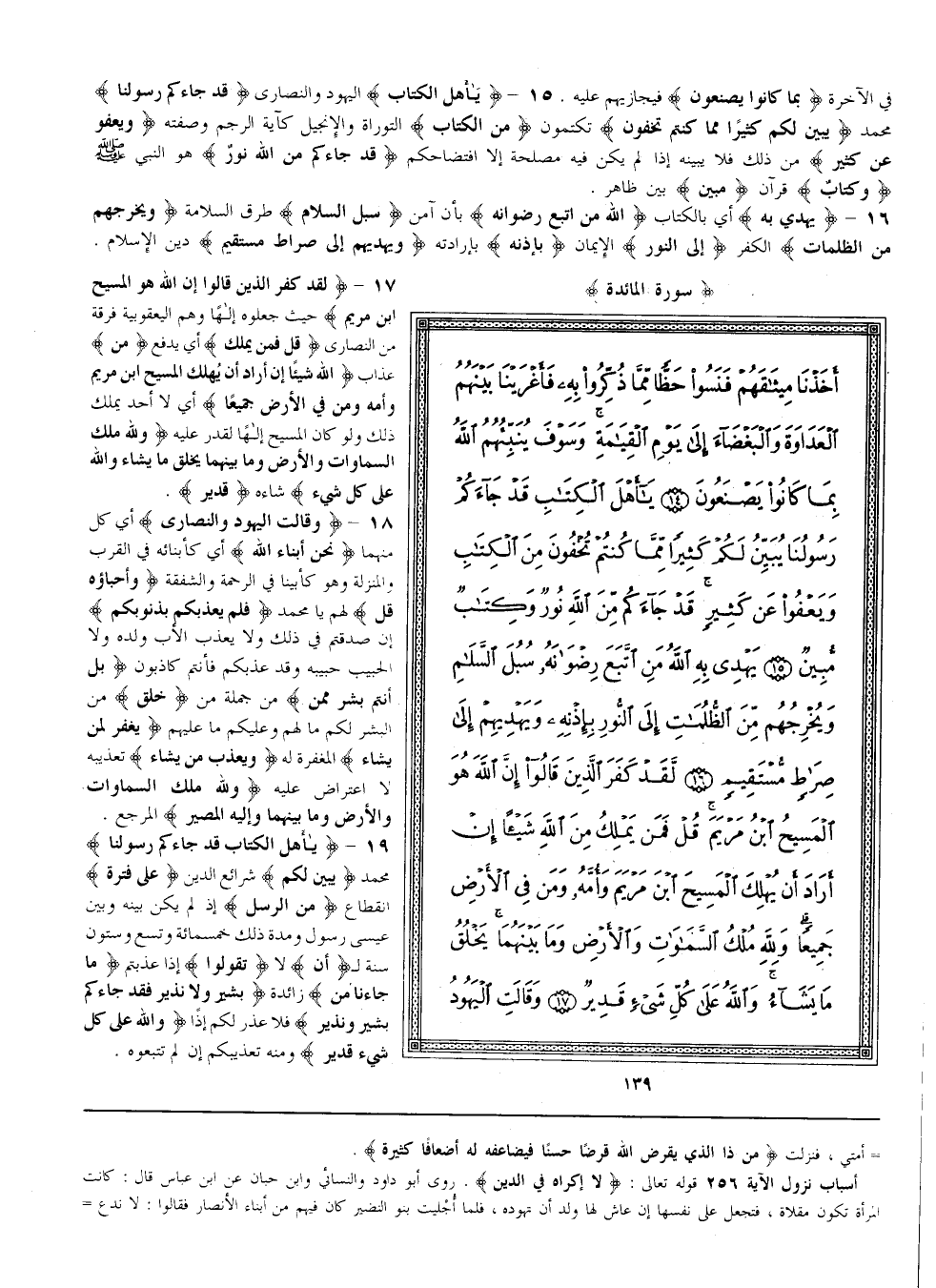 {وَمِنْ الَّذِينَ قَالُوا إنَّا نَصَارَى} مُتَعَلِّق بِقَوْلِهِ {أَخَذْنَا مِيثَاقهمْ} كَمَا أَخَذْنَا عَلَى بَنِي إسْرَائِيل الْيَهُود {فَنَسُوا حَظًّا مِمَّا ذُكِّرُوا بِهِ} فِي الْإِنْجِيل مِنْ الْإِيمَان وَغَيْره وَنَقَضُوا الْمِيثَاق {فَأَغْرَيْنَا} أَوْقَعْنَا {بَيْنهمْ الْعَدَاوَة وَالْبَغْضَاء إلَى يَوْم الْقِيَامَة} بِتَفَرُّقِهِمْ وَاخْتِلَاف أَهْوَائِهِمْ فَكُلّ فِرْقَة تُكَفِّر الْأُخْرَى {وَسَوْفَ يُنَبِّئهُمْ اللَّه} فِي الْآخِرَة {بِمَا كَانُوا يصنعون} فيجازيهم عليه