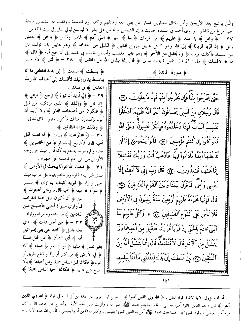 {وَاتْلُ} يَا مُحَمَّد {عَلَيْهِمْ} عَلَى قَوْمك {نَبَأ} خبر {ابني آدم} لهابيل وَقَابِيل {بِالْحَقِّ} مُتَعَلِّق باُتْلُ {إذْ قَرَّبَا قُرْبَانًا} إلى الله وهو كبش هابيل وَزَرْع لِقَابِيلَ {فَتُقُبِّلَ مِنْ أَحَدهمَا} وَهُوَ هَابِيل بِأَنْ نَزَلَتْ نَار مِنْ السَّمَاء فَأَكَلَتْ قُرْبَانه {وَلَمْ يُتَقَبَّل مِنْ الْآخَر} وَهُوَ قَابِيل فَغَضِبَ وَأَضْمَرَ الْحَسَد فِي نَفْسه إلَى أَنْ حَجّ آدَم {قَالَ} لَهُ {لَأَقْتُلَنك} قَالَ لِمَ قَالَ لتقبل قربانك دوني {قال إنما يتقبل الله من المتقين}
