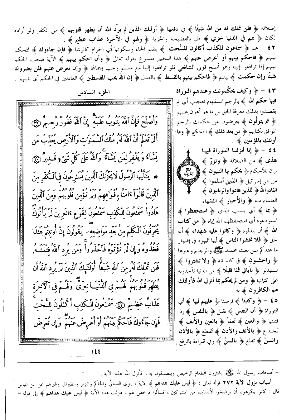 {إنَّا أَنْزَلْنَا التَّوْرَاة فِيهَا هُدًى} مِنْ الضَّلَالَة {وَنُور} بَيَان لِلْأَحْكَامِ {يَحْكُم بِهَا النَّبِيُّونَ} مِنْ بَنِي إسْرَائِيل {الَّذِينَ أَسْلَمُوا} انْقَادُوا لِلَّهِ {لِلَّذِينَ هادوا والربانيون} العلماء منهم {وَالْأَحْبَار} الْفُقَهَاء {بِمَا} أَيْ بِسَبَبِ الَّذِي {اُسْتُحْفِظُوا} اُسْتُوْدِعُوهُ أَيْ اسْتَحْفَظَهُمْ اللَّه إيَّاهُ {مِنْ كِتَاب اللَّه} أَنْ يُبَدِّلُوهُ {وَكَانُوا عَلَيْهِ شُهَدَاء} أَنَّهُ حَقّ {فَلَا تَخْشَوْا النَّاس} أَيّهَا الْيَهُود فِي إظْهَار مَا عِنْدكُمْ مِنْ نَعْت مُحَمَّد صَلَّى الله عليه وسلم والرجم وغيرها {واخشون} فِي كِتْمَانه {وَلَا تَشْتَرُوا} تَسْتَبْدِلُوا {بِآيَاتِي ثَمَنًا قَلِيلًا} مِنْ الدُّنْيَا تَأْخُذُونَهُ عَلَى كِتْمَانهَا {وَمَنْ لَمْ يَحْكُم بِمَا أَنْزَلَ اللَّه فَأُولَئِكَ هُمْ الكافرون} به